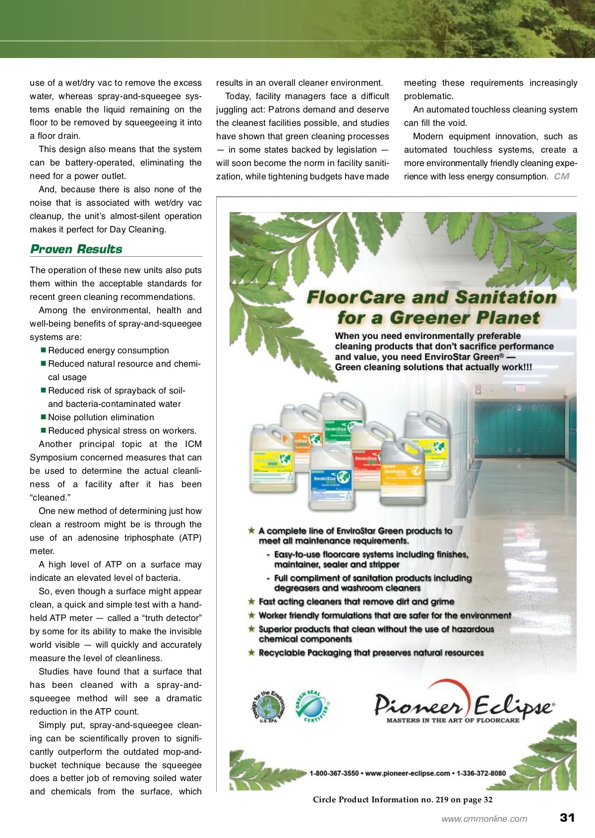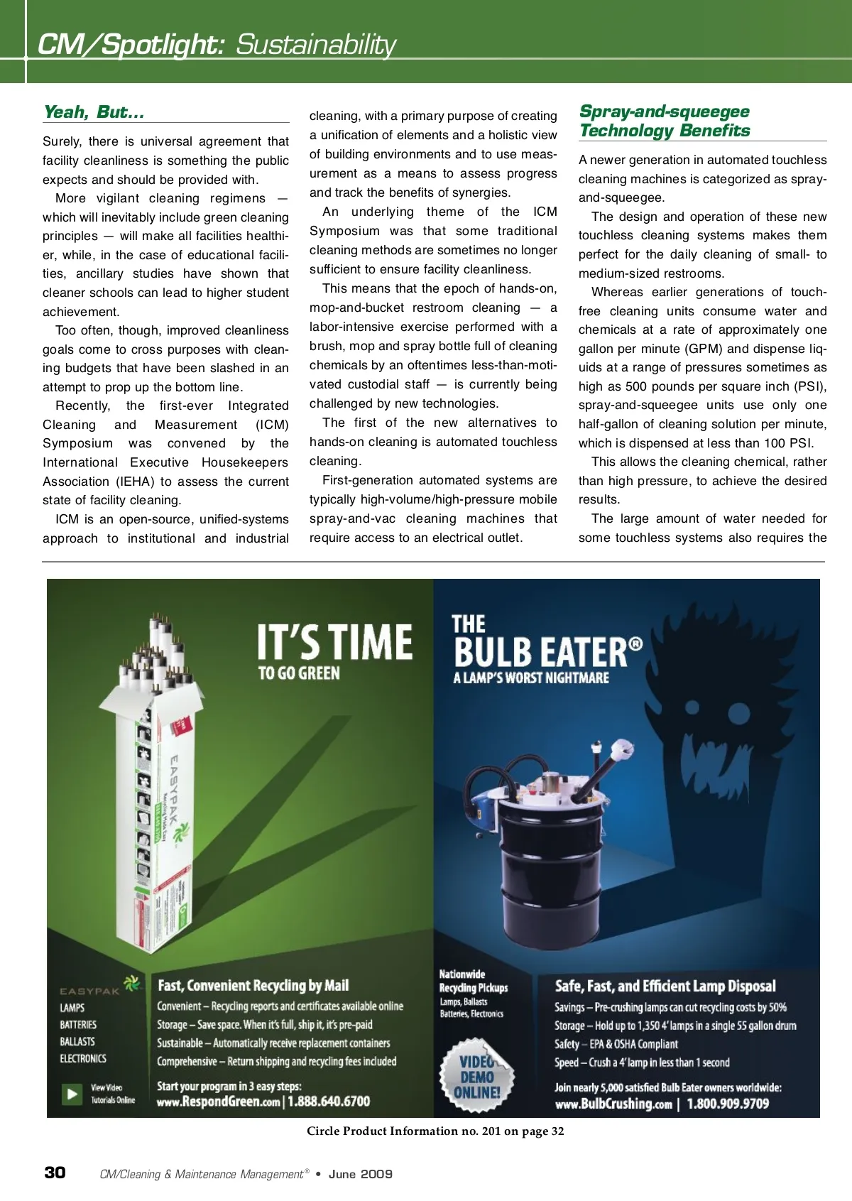 CM/Spotlight: Sustainability Yeah, But… Surely, there is universal agreement that facility cleanliness is something the public expects and should be provided with. More vigilant cleaning regimens — which will inevitably include green cleaning principles — will make all facilities healthi-er, while, in the case of educational facili-ties, ancillary studies have shown that cleaner schools can lead to higher student achievement. Too often, though, improved cleanliness goals come to cross purposes with clean-ing budgets that have been slashed in an attempt to prop up the bottom line. Recently, the first-ever Integrated Cleaning and Measurement (ICM) Symposium was convened by the International Executive Housekeepers Association (IEHA) to assess the current state of facility cleaning. ICM is an open-source, unified-systems approach to institutional and industrial cleaning, with a primary purpose of creating a unification of elements and a holistic view of building environments and to use meas-urement as a means to assess progress and track the benefits of synergies. An underlying theme of the ICM Symposium was that some traditional cleaning methods are sometimes no longer sufficient to ensure facility cleanliness. This means that the epoch of hands-on, mop-and-bucket restroom cleaning — a labor-intensive exercise performed with a brush, mop and spray bottle full of cleaning chemicals by an oftentimes less-than-moti-vated custodial staff — is currently being challenged by new technologies. The first of the new alternatives to hands-on cleaning is automated touchless cleaning. First-generation automated systems are typically high-volume/high-pressure mobile spray-and-vac cleaning machines that require access to an electrical outlet. Spray-and-squeegee Technology Benefits A newer generation in automated touchless cleaning machines is categorized as spray-and-squeegee. The design and operation of these new touchless cleaning systems makes them perfect for the daily cleaning of small-to medium-sized restrooms. Whereas earlier generations of touch-free cleaning units consume water and chemicals at a rate of approximately one gallon per minute (GPM) and dispense liq-uids at a range of pressures sometimes as high as 500 pounds per square inch (PSI), spray-and-squeegee units use only one half-gallon of cleaning solution per minute, which is dispensed at less than 100 PSI. This allows the cleaning chemical, rather than high pressure, to achieve the desired results. The large amount of water needed for some touchless systems also requires the Circle Product Information no. 201 on page 32 30 CM/Cleaning & Maintenance Management ® • June 2009