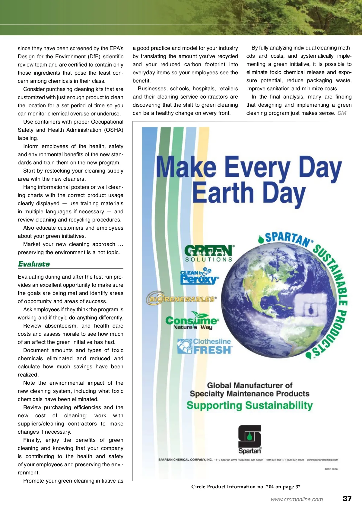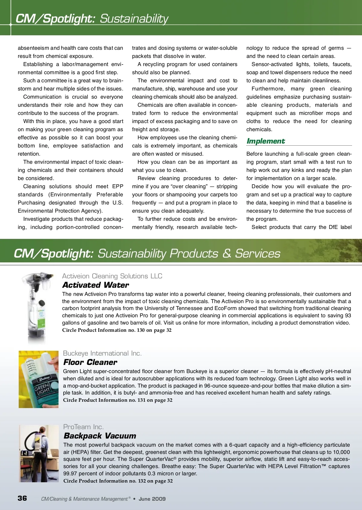 CM/Spotlight: Sustainability absenteeism and health care costs that can result from chemical exposure. Establishing a labor/management envi-ronmental committee is a good first step. Such a committee is a great way to brain-storm and hear multiple sides of the issues. Communication is crucial so everyone understands their role and how they can contribute to the success of the program. With this in place, you have a good start on making your green cleaning program as effective as possible so it can boost your bottom line, employee satisfaction and retention. The environmental impact of toxic clean-ing chemicals and their containers should be considered. Cleaning solutions should meet EPP standards (Environmentally Preferable Purchasing designated through the U.S. Environmental Protection Agency). Investigate products that reduce packag-ing, including portion-controlled concen-trates and dosing systems or water-soluble packets that dissolve in water. A recycling program for used containers should also be planned. The environmental impact and cost to manufacture, ship, warehouse and use your cleaning chemicals should also be analyzed. Chemicals are often available in concen-trated form to reduce the environmental impact of excess packaging and to save on freight and storage. How employees use the cleaning chemi-cals is extremely important, as chemicals are often wasted or misused. How you clean can be as important as what you use to clean. Review cleaning procedures to deter-mine if you are “over cleaning” — stripping your floors or shampooing your carpets too frequently — and put a program in place to ensure you clean adequately. To further reduce costs and be environ-mentally friendly, research available tech-nology to reduce the spread of germs — and the need to clean certain areas. Sensor-activated lights, toilets, faucets, soap and towel dispensers reduce the need to clean and help maintain cleanliness. Furthermore, many green cleaning guidelines emphasize purchasing sustain-able cleaning products, materials and equipment such as microfiber mops and cloths to reduce the need for cleaning chemicals. Implement Before launching a full-scale green clean-ing program, start small with a test run to help work out any kinks and ready the plan for implementation on a larger scale. Decide how you will evaluate the pro-gram and set up a practical way to capture the data, keeping in mind that a baseline is necessary to determine the true success of the program. Select products that carry the DfE label CM/Spotlight: Sustainability Products & Services Activeion Cleaning Solutions LLC Activated Water The new Activeion Pro transforms tap water into a powerful cleaner, freeing cleaning professionals, their customers and the environment from the impact of toxic cleaning chemicals. The Activeion Pro is so environmentally sustainable that a carbon footprint analysis from the University of Tennessee and EcoForm showed that switching from traditional cleaning chemicals to just one Activeion Pro for general-purpose cleaning in commercial applications is equivalent to saving 93 gallons of gasoline and two barrels of oil. Visit us online for more information, including a product demonstration video. Circle Product Information no. 130 on page 32 Buckeye International Inc. Floor Cleaner Green Light super-concentrated floor cleaner from Buckeye is a superior cleaner — its formula is effectively pH-neutral when diluted and is ideal for autoscrubber applications with its reduced foam technology. Green Light also works well in a mop-and-bucket application. The product is packaged in 96-ounce squeeze-and-pour bottles that make dilution a sim-ple task. In addition, it is butyl-and ammonia-free and has received excellent human health and safety ratings. Circle Product Information no. 131 on page 32 ProTeam Inc. Backpack Vacuum The most powerful backpack vacuum on the market comes with a 6-quart capacity and a high-efficiency particulate air (HEPA) filter. Get the deepest, greenest clean with this lightweight, ergonomic powerhouse that cleans up to 10,000 square feet per hour. The Super QuarterVac ® provides mobility, superior airflow, static lift and easy-to-reach acces-sories for all your cleaning challenges. Breathe easy: The Super QuarterVac with HEPA Level Filtration™ captures 99.97 percent of indoor pollutants 0.3 micron or larger. Circle Product Information no. 132 on page 32 36 CM/Cleaning & Maintenance Management ® • June 2009