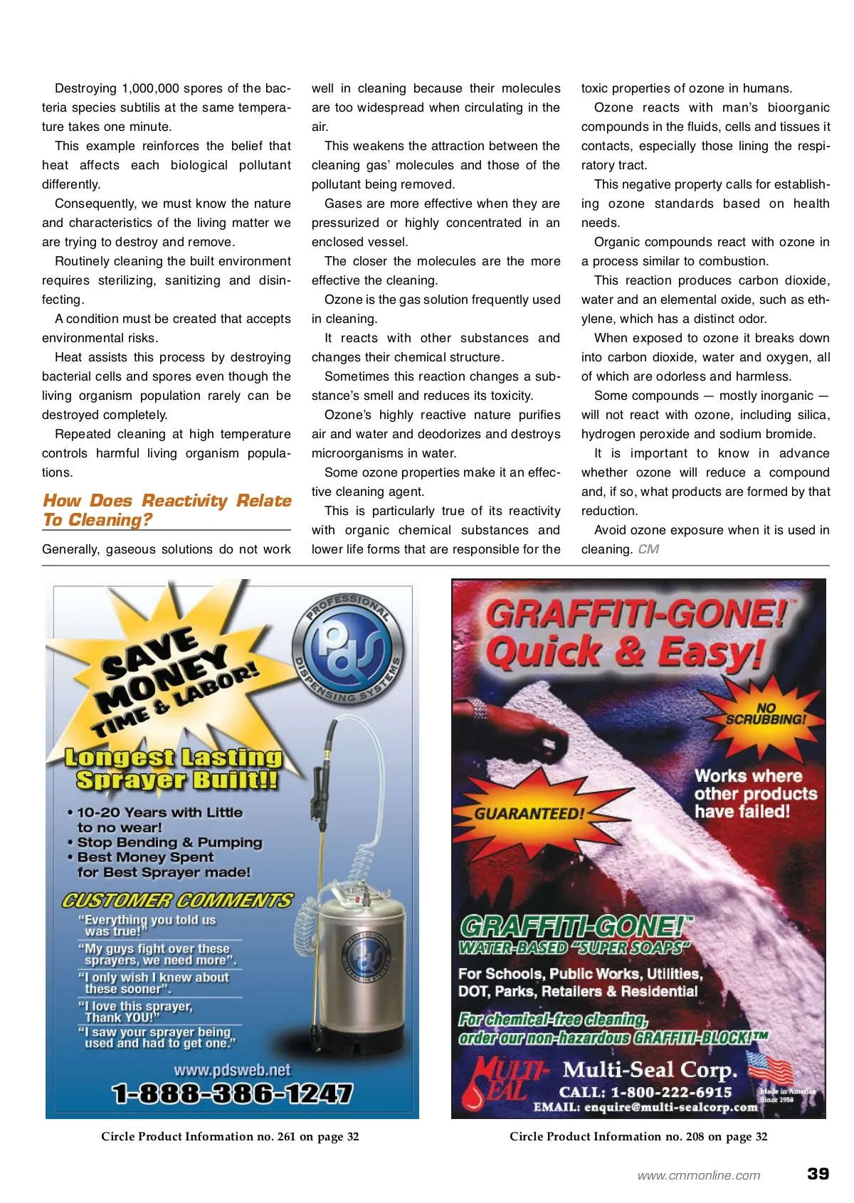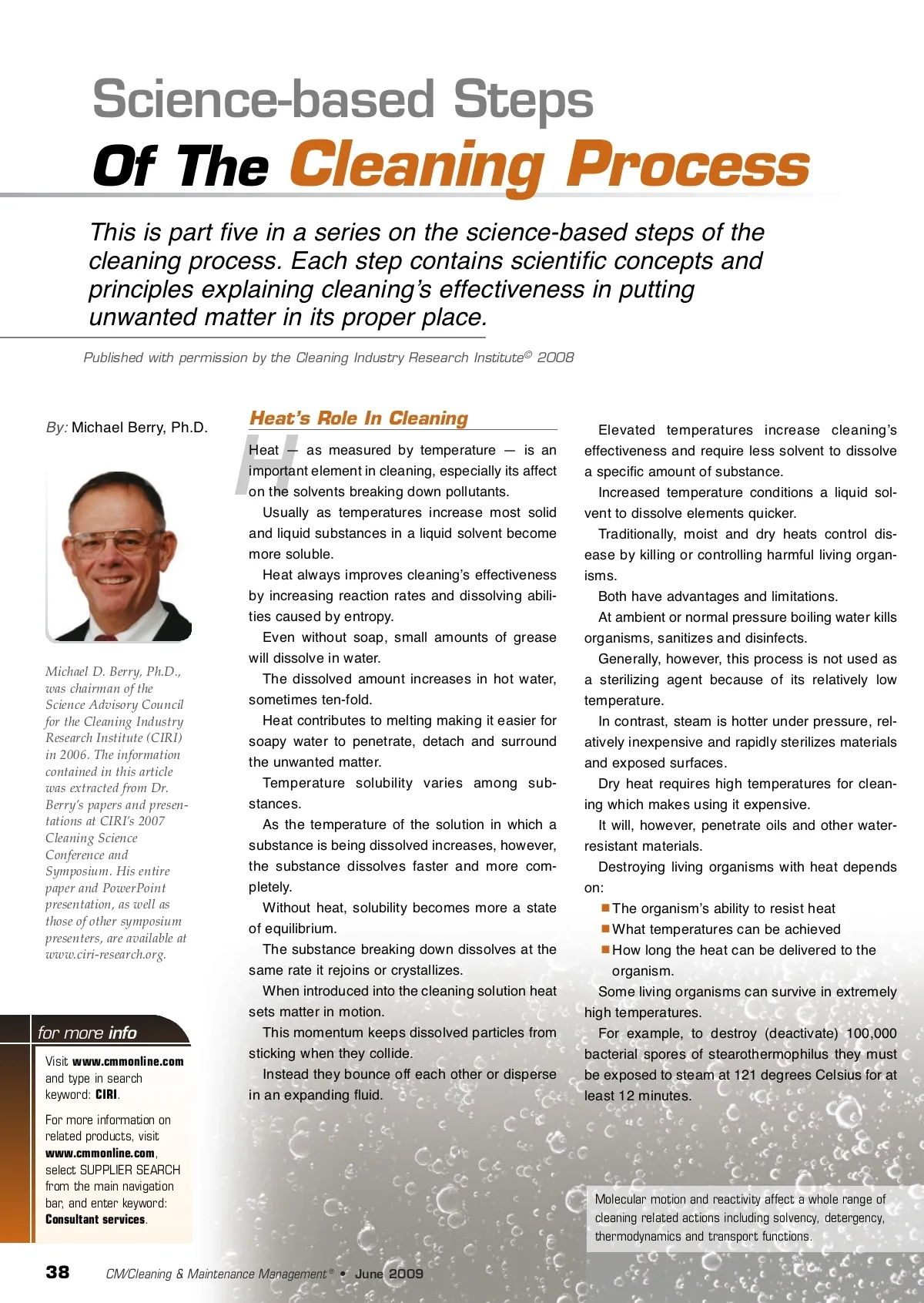 Science-based Steps Of The Cleaning Process This is part five in a series on the science-based steps of the cleaning process. Each step contains scientific concepts and principles explaining cleaningʼs effectiveness in putting unwanted matter in its proper place. Published with permission by the Cleaning Industry Research Institute © 2008 By: Michael Berry, Ph.D. Heat’s Role In Cleaning H Michael D. Berry, Ph.D., was chairman of the Science Advisory Council for the Cleaning Industry Research Institute (CIRI) in 2006. The information contained in this article was extracted from Dr. Berry’s papers and presen-tations at CIRI’s 2007 Cleaning Science Conference and Symposium. His entire paper and PowerPoint presentation, as well as those of other symposium presenters, are available at www.ciri-research.org. for more info Visit www.cmmonline.com and type in search keyword: CIRI . For more information on related products, visit www.cmmonline.com , select SUPPLIER SEARCH from the main navigation bar, and enter keyword: Consultant services . Heat — as measured by temperature — is an important element in cleaning, especially its affect on the solvents breaking down pollutants. Usually as temperatures increase most solid and liquid substances in a liquid solvent become more soluble. Heat always improves cleaningʼs effectiveness by increasing reaction rates and dissolving abili-ties caused by entropy. Even without soap, small amounts of grease will dissolve in water. The dissolved amount increases in hot water, sometimes ten-fold. Heat contributes to melting making it easier for soapy water to penetrate, detach and surround the unwanted matter. Temperature solubility varies among sub-stances. As the temperature of the solution in which a substance is being dissolved increases, however, the substance dissolves faster and more com-pletely. Without heat, solubility becomes more a state of equilibrium. The substance breaking down dissolves at the same rate it rejoins or crystallizes. When introduced into the cleaning solution heat sets matter in motion. This momentum keeps dissolved particles from sticking when they collide. Instead they bounce off each other or disperse in an expanding fluid. Elevated temperatures increase cleaningʼs effectiveness and require less solvent to dissolve a specific amount of substance. Increased temperature conditions a liquid sol-vent to dissolve elements quicker. Traditionally, moist and dry heats control dis-ease by killing or controlling harmful living organ-isms. Both have advantages and limitations. At ambient or normal pressure boiling water kills organisms, sanitizes and disinfects. Generally, however, this process is not used as a sterilizing agent because of its relatively low temperature. In contrast, steam is hotter under pressure, rel-atively inexpensive and rapidly sterilizes materials and exposed surfaces. Dry heat requires high temperatures for clean-ing which makes using it expensive. It will, however, penetrate oils and other water-resistant materials. Destroying living organisms with heat depends on: The organismʼs ability to resist heat What temperatures can be achieved How long the heat can be delivered to the organism. Some living organisms can survive in extremely high temperatures. For example, to destroy (deactivate) 100,000 bacterial spores of stearothermophilus they must be exposed to steam at 121 degrees Celsius for at least 12 minutes. Molecular motion and reactivity affect a whole range of cleaning related actions including solvency, detergency, thermodynamics and transport functions. 38 CM/Cleaning & Maintenance Management ® • June 2009