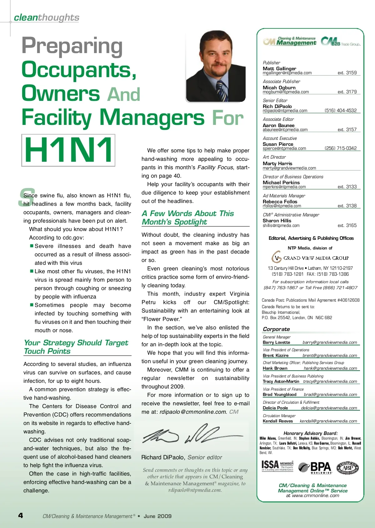 cleanthoughts Preparing Occupants, Owners And Facility Managers For Publisher Matt Gallinger mgallinger @ ntpmedia.com Associate Publisher Micah Ogburn mogburn @ ntpmedia.com Senior Editor Rich DiPaolo rdipaolo @ ntpmedia.com Associate Editor Aaron Baunee abaunee @ ntpmedia.com Account Executive Susan Pierce spierce @ ntpmedia.com Art Director Marty Harris marty @ grandviewmedia.com Director of Business Operations Michael Perkins mperkins @ ntpmedia.com Ad Materials Manager Rebecca Follos [email protected] CMI Administrative Manager Sharon Hillis shillis @ ntpmedia.com ® ext. 3159 ext. 3179 (516) 404-4532 ext. 3157 H1N1 S Since swine flu, also known as H1N1 flu, hit headlines a few months back, facility occupants, owners, managers and clean-ing professionals have been put on alert. What should you know about H1N1? According to cdc.gov: Severe illnesses and death have occurred as a result of illness associ-ated with this virus Like most other flu viruses, the H1N1 virus is spread mainly from person to person through coughing or sneezing by people with influenza Sometimes people may become infected by touching something with flu viruses on it and then touching their mouth or nose. We offer some tips to help make proper hand-washing more appealing to occu-pants in this monthʼs Facility Focus, start-ing on page 40. Help your facilityʼs occupants with their due diligence to keep your establishment out of the headlines. (256) 715-0342 ext. 3133 ext. 3138 A Few Words About This Month’s Spotlight Without doubt, the cleaning industry has not seen a movement make as big an impact as green has in the past decade or so. Even green cleaningʼs most notorious critics practice some form of enviro-friend-ly cleaning today. This month, industry expert Virginia Petru kicks off our CM/Spotlight: Sustainability with an entertaining look at “Flower Power.” In the section, weʼve also enlisted the help of top sustainability experts in the field for an in-depth look at the topic. We hope that you will find this informa-tion useful in your green cleaning journey. Moreover, CMM is continuing to offer a regular newsletter on sustainability throughout 2009. For more information or to sign up to receive the newsletter, feel free to e-mail me at: [email protected] . CM ext. 3165 Editorial, Advertising & Publishing Offices NTP Media, division of 13 Century Hill Drive • Latham, NY 12110-2197 (518) 783-1281 FAX: (518) 783-1386 For subscription information local calls (847) 763-1867 or Toll Free (866) 721-4807 Canada Post: Publications Mail Agreement #40612608 Canada Returns to be sent to: Bleuchip International, P.O. Box 25542, London, ON N6C 6B2 Corporate General Manager Barry Lovette [email protected] Your Strategy Should Target Touch Points According to several studies, an influenza virus can survive on surfaces, and cause infection, for up to eight hours. A common prevention strategy is effec-tive hand-washing. The Centers for Disease Control and Prevention (CDC) offers recommendations on its website in regards to effective hand-washing. CDC advises not only traditional soap-and-water techniques, but also the fre-quent use of alcohol-based hand cleaners to help fight the influenza virus. Often the case in high-traffic facilities, enforcing effective hand-washing can be a challenge. Vice President of Operations Brent Kizzire [email protected] Chief Marketing Officer, Publishing Services Group Hank Brown [email protected] Vice President of Business Publishing Tracy Aston-Martin [email protected] Vice President of Finance Brad Youngblood [email protected] Director of Circulation & Fulfillment Delicia Poole [email protected] Circulation Manager Kendall Reeves [email protected] Honorary Advisory Board: Mike Adams, Greenfield, IN; Stephen Ashkin, Bloomington, IN; Jim Brewer, Arlington, TX; Laura Dellutri, Lenexa, KS; Ron Goerne, Bloomington, IL; Russell Kendzior, Southlake, TX; Don McNulty, Blue Springs, MO; Bob Merkt, West Bend, WI. Richard DiPaolo, Senior editor Send comments or thoughts on this topic or any other article that appears in CM/Cleaning & Maintenance Management ® magazine, to [email protected]. CM/Cleaning & Maintenance Management Online™ Service at www.cmmonline.com 4 CM/Cleaning & Maintenance Management ® • June 2009