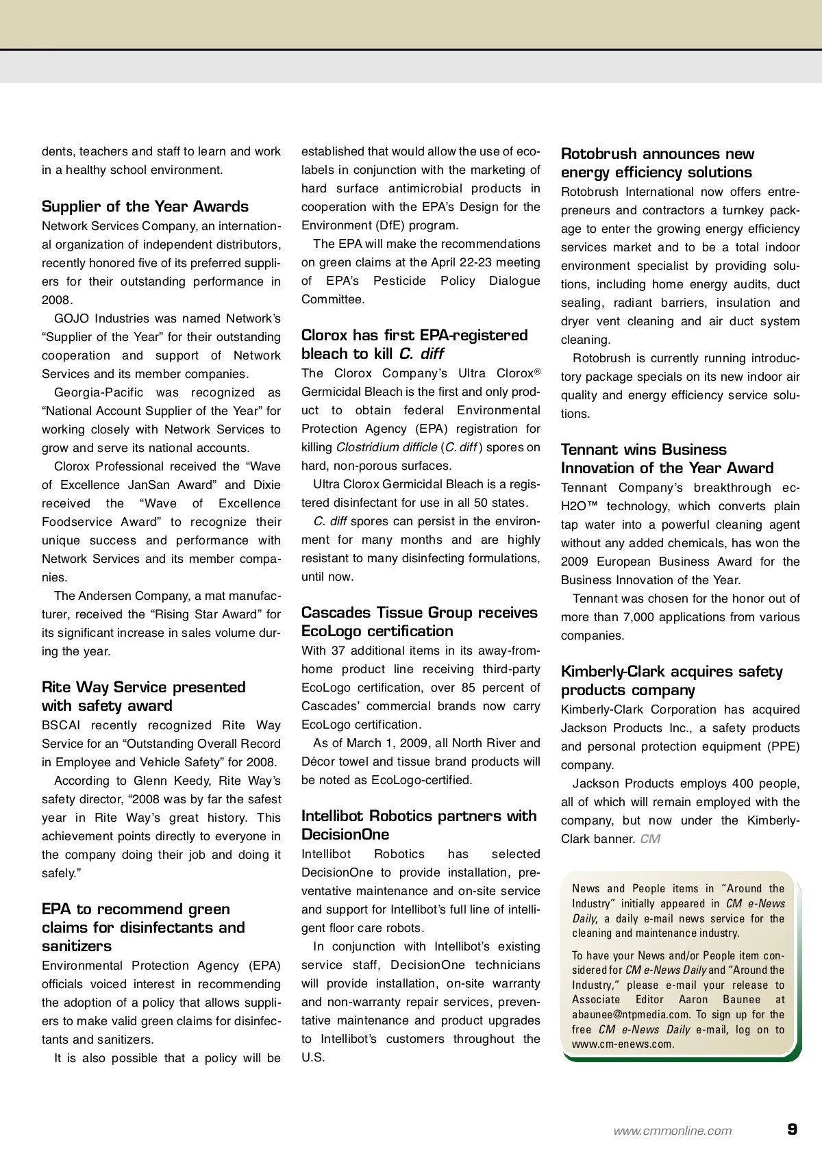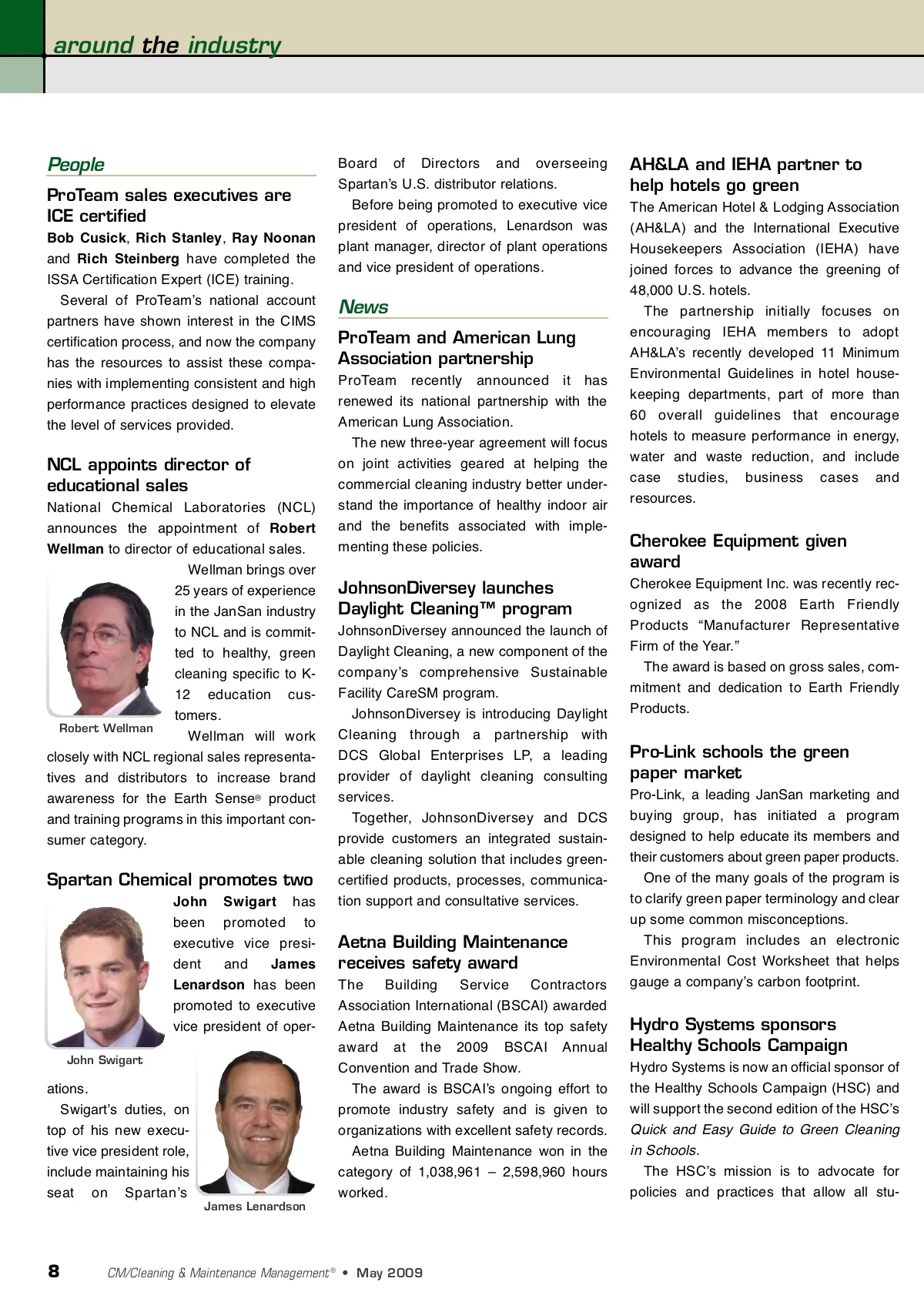 around the industry People ProTeam sales executives are ICE certified Bob Cusick , Rich Stanley , Ray Noonan and Rich Steinberg have completed the ISSA Certification Expert (ICE) training. Several of ProTeamʼs national account partners have shown interest in the CIMS certification process, and now the company has the resources to assist these compa-nies with implementing consistent and high performance practices designed to elevate the level of services provided. Board of Directors and overseeing Spartanʼs U.S. distributor relations. Before being promoted to executive vice president of operations, Lenardson was plant manager, director of plant operations and vice president of operations. AH&LA and IEHA partner to help hotels go green The American Hotel & Lodging Association (AH&LA) and the International Executive Housekeepers Association (IEHA) have joined forces to advance the greening of 48,000 U.S. hotels. The partnership initially focuses on encouraging IEHA members to adopt AH&LAʼs recently developed 11 Minimum Environmental Guidelines in hotel house-keeping departments, part of more than 60 overall guidelines that encourage hotels to measure performance in energy, water and waste reduction, and include case studies, business cases and resources. News ProTeam and American Lung Association partnership ProTeam recently announced it has renewed its national partnership with the American Lung Association. The new three-year agreement will focus on joint activities geared at helping the commercial cleaning industry better under-stand the importance of healthy indoor air and the benefits associated with imple-menting these policies. NCL appoints director of educational sales National Chemical Laboratories (NCL) announces the appointment of Robert Wellman to director of educational sales. Wellman brings over 25 years of experience in the JanSan industry to NCL and is commit-ted to healthy, green cleaning specific to K-12 education cus-tomers. Robert Wellman Wellman will work closely with NCL regional sales representa-tives and distributors to increase brand awareness for the Earth Sense ® product and training programs in this important con-sumer category. Cherokee Equipment given award Cherokee Equipment Inc. was recently rec-ognized as the 2008 Earth Friendly Products “Manufacturer Representative Firm of the Year.” The award is based on gross sales, com-mitment and dedication to Earth Friendly Products. JohnsonDiversey launches Daylight Cleaning™ program JohnsonDiversey announced the launch of Daylight Cleaning, a new component of the companyʼs comprehensive Sustainable Facility CareSM program. JohnsonDiversey is introducing Daylight Cleaning through a partnership with DCS Global Enterprises LP, a leading provider of daylight cleaning consulting services. Together, JohnsonDiversey and DCS provide customers an integrated sustain-able cleaning solution that includes green-certified products, processes, communica-tion support and consultative services. Pro-Link schools the green paper market Pro-Link, a leading JanSan marketing and buying group, has initiated a program designed to help educate its members and their customers about green paper products. One of the many goals of the program is to clarify green paper terminology and clear up some common misconceptions. This program includes an electronic Environmental Cost Worksheet that helps gauge a companyʼs carbon footprint. Spartan Chemical promotes two John Swigart has been promoted to executive vice presi-dent and James Lenardson has been promoted to executive vice president of oper-John Swigart Aetna Building Maintenance receives safety award The Building Service Contractors Association International (BSCAI) awarded Aetna Building Maintenance its top safety award at the 2009 BSCAI Annual Convention and Trade Show. The award is BSCAIʼs ongoing effort to promote industry safety and is given to organizations with excellent safety records. Aetna Building Maintenance won in the category of 1,038,961 – 2,598,960 hours worked. Hydro Systems sponsors Healthy Schools Campaign Hydro Systems is now an official sponsor of the Healthy Schools Campaign (HSC) and will support the second edition of the HSCʼs Quick and Easy Guide to Green Cleaning in Schools. The HSCʼs mission is to advocate for policies and practices that allow all stu-ations. Swigartʼs duties, on top of his new execu-tive vice president role, include maintaining his seat on Spartanʼs James Lenardson 8 CM/Cleaning & Maintenance Management ® • May 2009