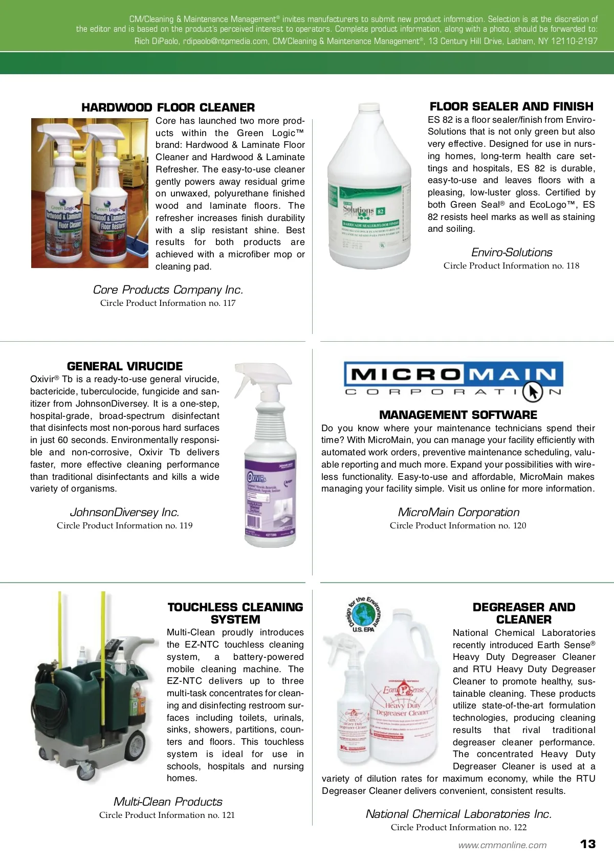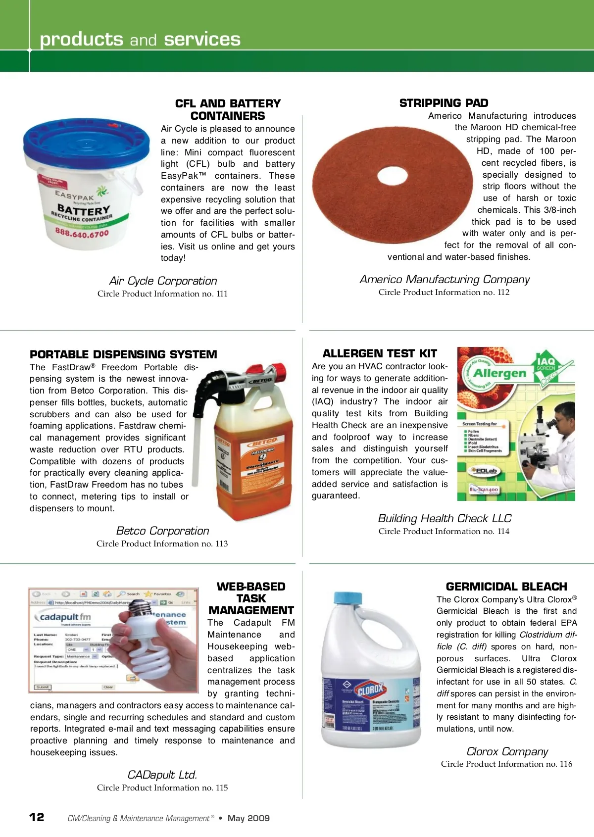 products and services CFL AND BATTERY CONTAINERS Air Cycle is pleased to announce a new addition to our product line: Mini compact fluorescent light (CFL) bulb and battery EasyPak™ containers. These containers are now the least expensive recycling solution that we offer and are the perfect solu-tion for facilities with smaller amounts of CFL bulbs or batter-ies. Visit us online and get yours today! STRIPPING PAD Americo Manufacturing introduces the Maroon HD chemical-free stripping pad. The Maroon HD, made of 100 per-cent recycled fibers, is specially designed to strip floors without the use of harsh or toxic chemicals. This 3/8-inch thick pad is to be used with water only and is per-fect for the removal of all con-ventional and water-based finishes. Air Cycle Corporation Circle Product Information no. 111 Americo Manufacturing Company Circle Product Information no. 112 PORTABLE DISPENSING SYSTEM The FastDraw ® Freedom Portable dis-pensing system is the newest innova-tion from Betco Corporation. This dis-penser fills bottles, buckets, automatic scrubbers and can also be used for foaming applications. Fastdraw chemi-cal management provides significant waste reduction over RTU products. Compatible with dozens of products for practically every cleaning applica-tion, FastDraw Freedom has no tubes to connect, metering tips to install or dispensers to mount. ALLERGEN TEST KIT Are you an HVAC contractor look-ing for ways to generate addition-al revenue in the indoor air quality (IAQ) industry? The indoor air quality test kits from Building Health Check are an inexpensive and foolproof way to increase sales and distinguish yourself from the competition. Your cus-tomers will appreciate the value-added service and satisfaction is guaranteed. Building Health Check LLC Betco Corporation Circle Product Information no. 113 Circle Product Information no. 114 WEB-BASED TASK MANAGEMENT The Cadapult FM Maintenance and Housekeeping web-based application centralizes the task management process by granting techni-cians, managers and contractors easy access to maintenance cal-endars, single and recurring schedules and standard and custom reports. Integrated e-mail and text messaging capabilities ensure proactive planning and timely response to maintenance and housekeeping issues. GERMICIDAL BLEACH The Clorox Companyʼs Ultra Clorox ® Germicidal Bleach is the first and only product to obtain federal EPA registration for killing Clostridium dif-ficle (C. diff) spores on hard, non-porous surfaces. Ultra Clorox Germicidal Bleach is a registered dis-infectant for use in all 50 states. C. diff spores can persist in the environ-ment for many months and are high-ly resistant to many disinfecting for-mulations, until now. Clorox Company Circle Product Information no. 116 CADapult Ltd. Circle Product Information no. 115 12 CM/Cleaning & Maintenance Management ® • May 2009