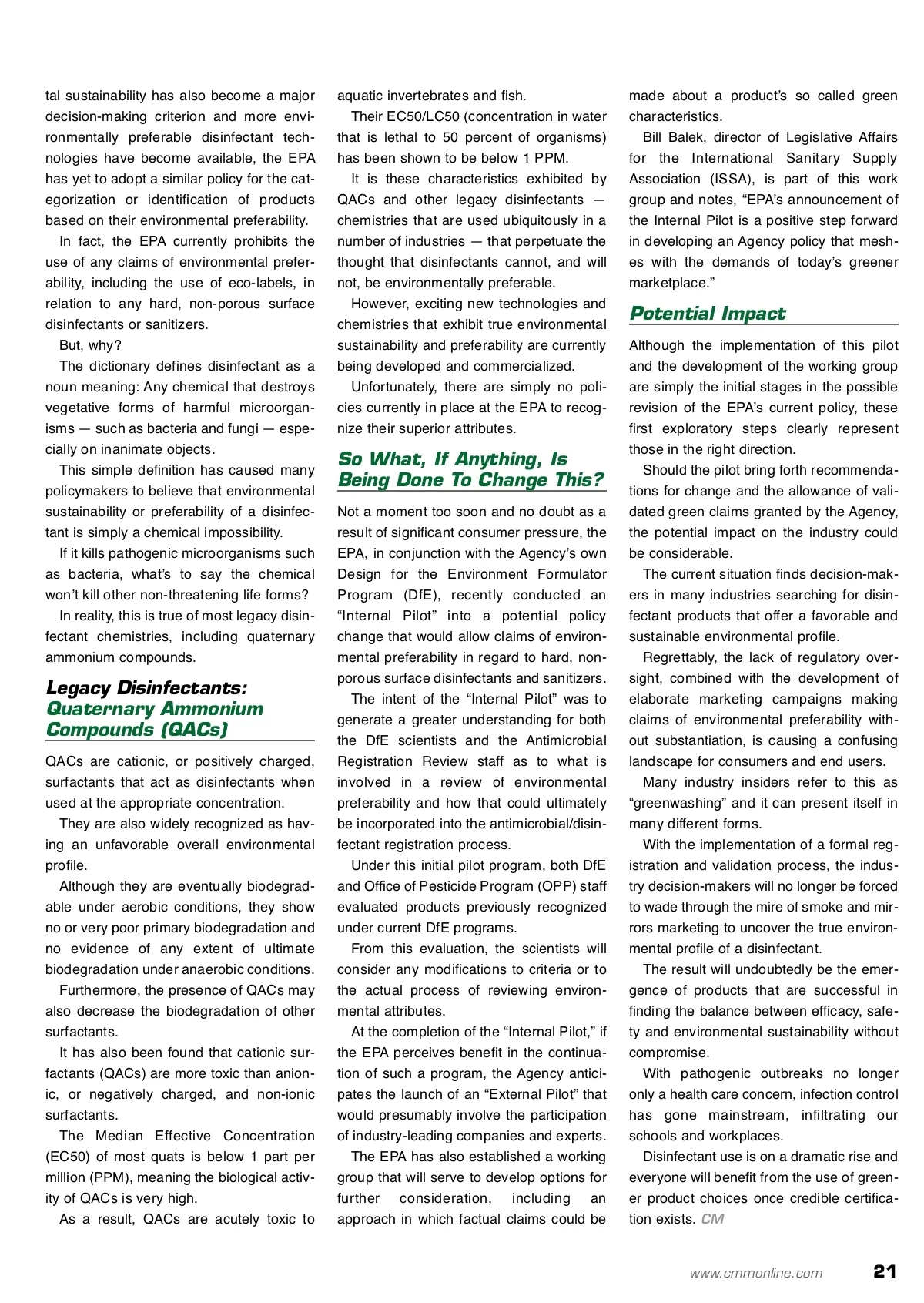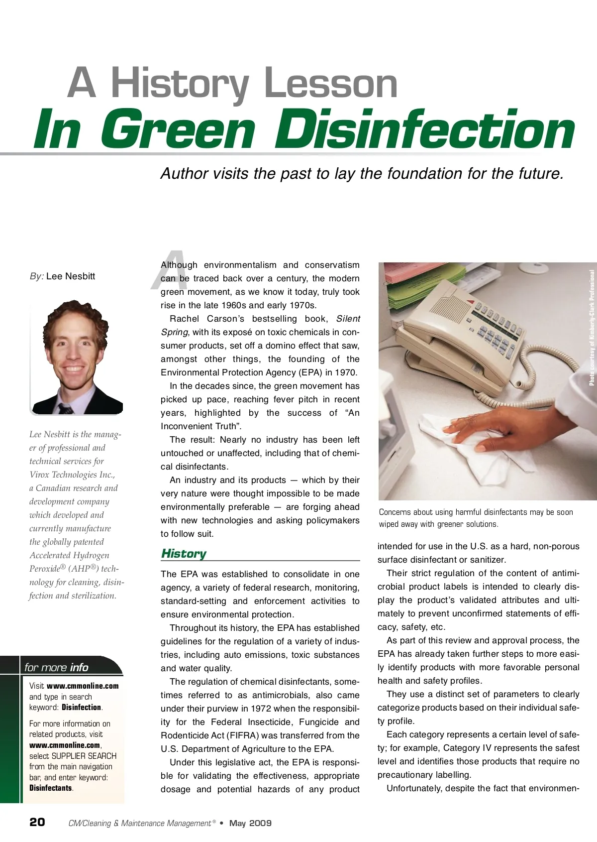 A History Lesson In Green Disinfection Author visits the past to lay the foundation for the future. By: Lee Nesbitt Photo courtesy of Kimberly-Clark Professional A Lee Nesbitt is the manag-er of professional and technical services for Virox Technologies Inc., a Canadian research and development company which developed and currently manufacture the globally patented Accelerated Hydrogen Peroxide ® (AHP ® ) tech-nology for cleaning, disin-fection and sterilization. Although environmentalism and conservatism can be traced back over a century, the modern green movement, as we know it today, truly took rise in the late 1960s and early 1970s. Rachel Carsonʼs bestselling book, Silent Spring , with its exposé on toxic chemicals in con-sumer products, set off a domino effect that saw, amongst other things, the founding of the Environmental Protection Agency (EPA) in 1970. In the decades since, the green movement has picked up pace, reaching fever pitch in recent years, highlighted by the success of “An Inconvenient Truth”. The result: Nearly no industry has been left untouched or unaffected, including that of chemi-cal disinfectants. An industry and its products — which by their very nature were thought impossible to be made environmentally preferable — are forging ahead with new technologies and asking policymakers to follow suit. Concerns about using harmful disinfectants may be soon wiped away with greener solutions. History The EPA was established to consolidate in one agency, a variety of federal research, monitoring, standard-setting and enforcement activities to ensure environmental protection. Throughout its history, the EPA has established guidelines for the regulation of a variety of indus-tries, including auto emissions, toxic substances and water quality. The regulation of chemical disinfectants, some-times referred to as antimicrobials, also came under their purview in 1972 when the responsibil-ity for the Federal Insecticide, Fungicide and Rodenticide Act (FIFRA) was transferred from the U.S. Department of Agriculture to the EPA. Under this legislative act, the EPA is responsi-ble for validating the effectiveness, appropriate dosage and potential hazards of any product for more info Visit www.cmmonline.com and type in search keyword: Disinfection . For more information on related products, visit www.cmmonline.com , select SUPPLIER SEARCH from the main navigation bar, and enter keyword: Disinfectants . intended for use in the U.S. as a hard, non-porous surface disinfectant or sanitizer. Their strict regulation of the content of antimi-crobial product labels is intended to clearly dis-play the productʼs validated attributes and ulti-mately to prevent unconfirmed statements of effi-cacy, safety, etc. As part of this review and approval process, the EPA has already taken further steps to more easi-ly identify products with more favorable personal health and safety profiles. They use a distinct set of parameters to clearly categorize products based on their individual safe-ty profile. Each category represents a certain level of safe-ty; for example, Category IV represents the safest level and identifies those products that require no precautionary labelling. Unfortunately, despite the fact that environmen-20 CM/Cleaning & Maintenance Management ® • May 2009