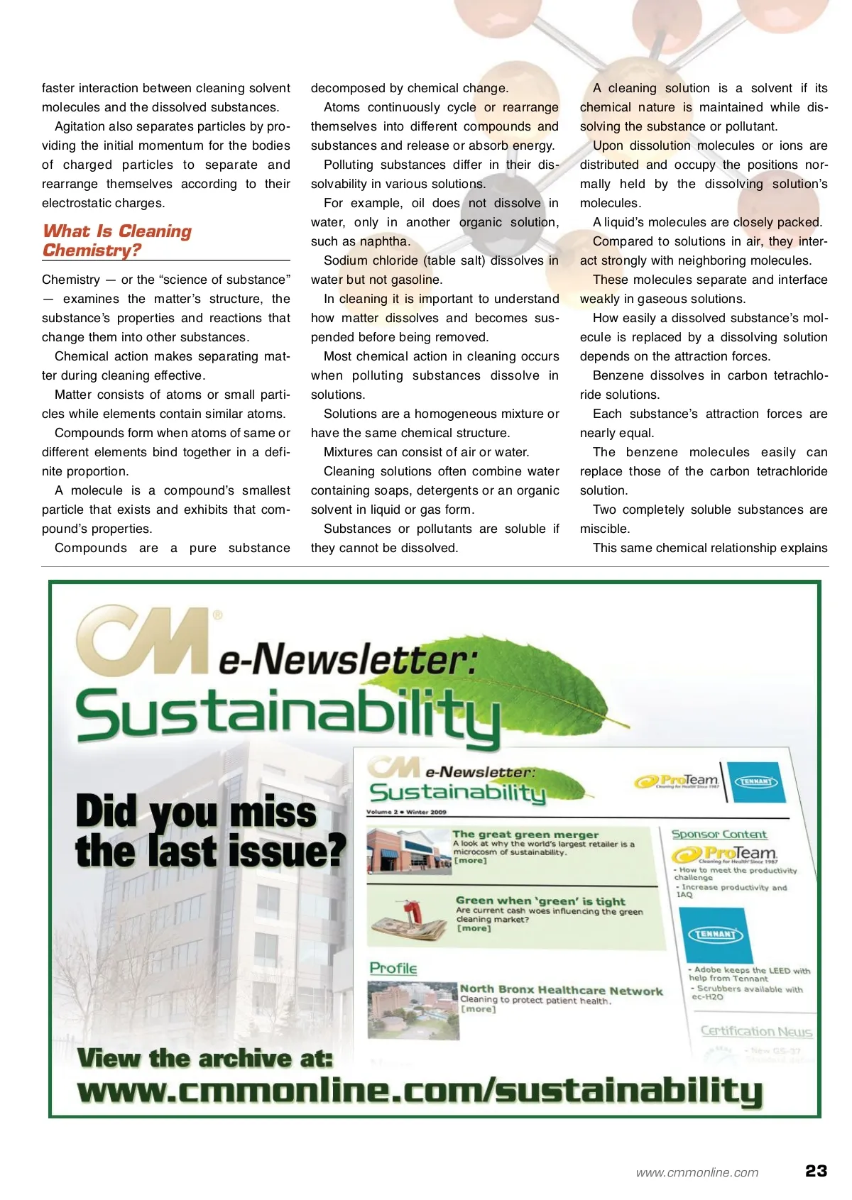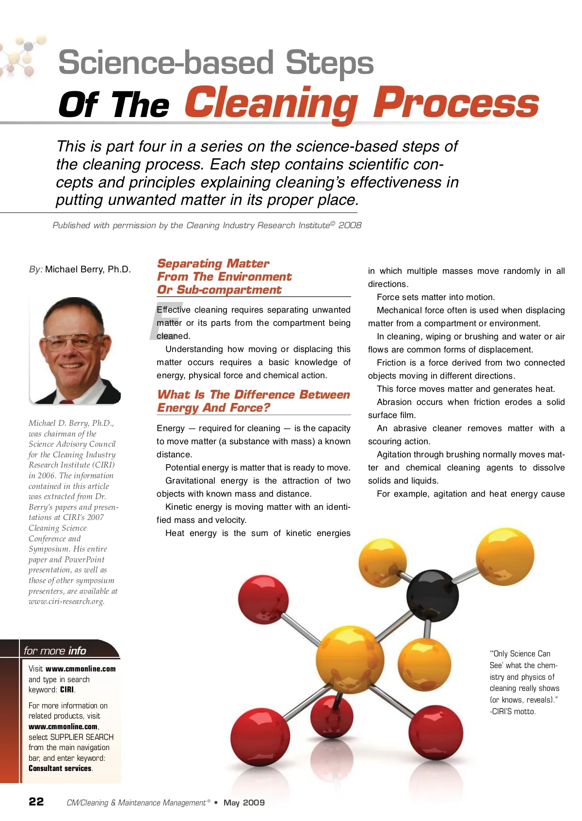 Science-based Steps Of The Cleaning Process This is part four in a series on the science-based steps of the cleaning process. Each step contains scientific con-cepts and principles explaining cleaningʼs effectiveness in putting unwanted matter in its proper place. Published with permission by the Cleaning Industry Research Institute © 2008 By: Michael Berry, Ph.D. Separating Matter From The Environment Or Sub-compartment E Michael D. Berry, Ph.D., was chairman of the Science Advisory Council for the Cleaning Industry Research Institute (CIRI) in 2006. The information contained in this article was extracted from Dr. Berry’s papers and presen-tations at CIRI’s 2007 Cleaning Science Conference and Symposium. His entire paper and PowerPoint presentation, as well as those of other symposium presenters, are available at www.ciri-research.org. Effective cleaning requires separating unwanted matter or its parts from the compartment being cleaned. Understanding how moving or displacing this matter occurs requires a basic knowledge of energy, physical force and chemical action. What Is The Difference Between Energy And Force? Energy — required for cleaning — is the capacity to move matter (a substance with mass) a known distance. Potential energy is matter that is ready to move. Gravitational energy is the attraction of two objects with known mass and distance. Kinetic energy is moving matter with an identi-fied mass and velocity. Heat energy is the sum of kinetic energies in which multiple masses move randomly in all directions. Force sets matter into motion. Mechanical force often is used when displacing matter from a compartment or environment. In cleaning, wiping or brushing and water or air flows are common forms of displacement. Friction is a force derived from two connected objects moving in different directions. This force moves matter and generates heat. Abrasion occurs when friction erodes a solid surface film. An abrasive cleaner removes matter with a scouring action. Agitation through brushing normally moves mat-ter and chemical cleaning agents to dissolve solids and liquids. For example, agitation and heat energy cause for more info Visit www.cmmonline.com and type in search keyword: CIRI . For more information on related products, visit www.cmmonline.com , select SUPPLIER SEARCH from the main navigation bar, and enter keyword: Consultant services . ‘“Only Science Can See’ what the chem-istry and physics of cleaning really shows (or knows, reveals).” -CIRI’S motto. 22 CM/Cleaning & Maintenance Management ® • May 2009