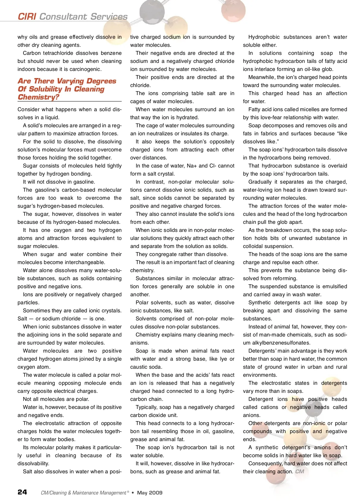 CIRI Consultant Services why oils and grease effectively dissolve in other dry cleaning agents. Carbon tetrachloride dissolves benzene but should never be used when cleaning indoors because it is carcinogenic. tive charged sodium ion is surrounded by water molecules. Their negative ends are directed at the sodium and a negatively charged chloride ion surrounded by water molecules. Their positive ends are directed at the chloride. The ions comprising table salt are in cages of water molecules. When water molecules surround an ion that way the ion is hydrated. The cage of water molecules surrounding an ion neutralizes or insulates its charge. It also keeps the solutionʼs oppositely charged ions from attracting each other over distances. In the case of water, Na+ and Cl-cannot form a salt crystal. In contrast, non-polar molecular solu-tions cannot dissolve ionic solids, such as salt, since solids cannot be separated by positive and negative charged forces. They also cannot insulate the solidʼs ions from each other. When ionic solids are in non-polar molec-ular solutions they quickly attract each other and separate from the solution as solids. They congregate rather than dissolve. The result is an important fact of cleaning chemistry. Substances similar in molecular attrac-tion forces generally are soluble in one another. Polar solvents, such as water, dissolve ionic substances, like salt. Solvents comprised of non-polar mole-cules dissolve non-polar substances. Chemistry explains many cleaning mech-anisms. Soap is made when animal fats react with water and a strong base, like lye or caustic soda. When the base and the acidsʼ fats react an ion is released that has a negatively charged head connected to a long hydro-carbon chain. Typically, soap has a negatively charged carbon dioxide unit. This head connects to a long hydrocar-bon tail resembling those in oil, gasoline, grease and animal fat. The soap ionʼs hydrocarbon tail is not water soluble. It will, however, dissolve in like hydrocar-bons, such as grease and animal fat. Hydrophobic substances arenʼt water soluble either. In solutions containing soap the hydrophobic hydrocarbon tails of fatty acid ions interlace forming an oil-like glob. Meanwhile, the ionʼs charged head points toward the surrounding water molecules. This charged head has an affection for water. Fatty acid ions called micelles are formed by this love-fear relationship with water. Soap decomposes and removes oils and fats in fabrics and surfaces because “like dissolves like.” The soap ionsʼ hydrocarbon tails dissolve in the hydrocarbons being removed. That hydrocarbon substance is overlaid by the soap ionsʼ hydrocarbon tails. Gradually it separates as the charged, water-loving ion head is drawn toward sur-rounding water molecules. The attraction forces of the water mole-cules and the head of the long hydrocarbon chain pull the glob apart. As the breakdown occurs, the soap solu-tion holds bits of unwanted substance in colloidal suspension. The heads of the soap ions are the same charge and repulse each other. This prevents the substance being dis-solved from reforming. The suspended substance is emulsified and carried away in wash water. Synthetic detergents act like soap by breaking apart and dissolving the same substances. Instead of animal fat, however, they con-sist of man-made chemicals, such as sodi-um alkylbenzenesulfonates. Detergentsʼ main advantage is they work better than soap in hard water, the common state of ground water in urban and rural environments. The electrostatic states in detergents vary more than in soaps. Detergent ions have positive heads called cations or negative heads called anions. Other detergents are non-ionic or polar compounds with positive and negative ends. A synthetic detergentʼs anions donʼt become solids in hard water like in soap. Consequently, hard water does not affect their cleaning action. CM Are There Varying Degrees Of Solubility In Cleaning Chemistry? Consider what happens when a solid dis-solves in a liquid. A solidʼs molecules are arranged in a reg-ular pattern to maximize attraction forces. For the solid to dissolve, the dissolving solutionʼs molecular forces must overcome those forces holding the solid together. Sugar consists of molecules held tightly together by hydrogen bonding. It will not dissolve in gasoline. The gasolineʼs carbon-based molecular forces are too weak to overcome the sugarʼs hydrogen-based molecules. The sugar, however, dissolves in water because of its hydrogen-based molecules. It has one oxygen and two hydrogen atoms and attraction forces equivalent to sugar molecules. When sugar and water combine their molecules become interchangeable. Water alone dissolves many water-solu-ble substances, such as solids containing positive and negative ions. Ions are positively or negatively charged particles. Sometimes they are called ionic crystals. Salt — or sodium chloride — is one. When ionic substances dissolve in water the adjoining ions in the solid separate and are surrounded by water molecules. Water molecules are two positive charged hydrogen atoms joined by a single oxygen atom. The water molecule is called a polar mol-ecule meaning opposing molecule ends carry opposite electrical charges. Not all molecules are polar. Water is, however, because of its positive and negative ends. The electrostatic attraction of opposite charges holds the water molecules togeth-er to form water bodies. Its molecular polarity makes it particular-ly useful in cleaning because of its dissolvability. Salt also dissolves in water when a posi-24 CM/Cleaning & Maintenance Management ® • May 2009