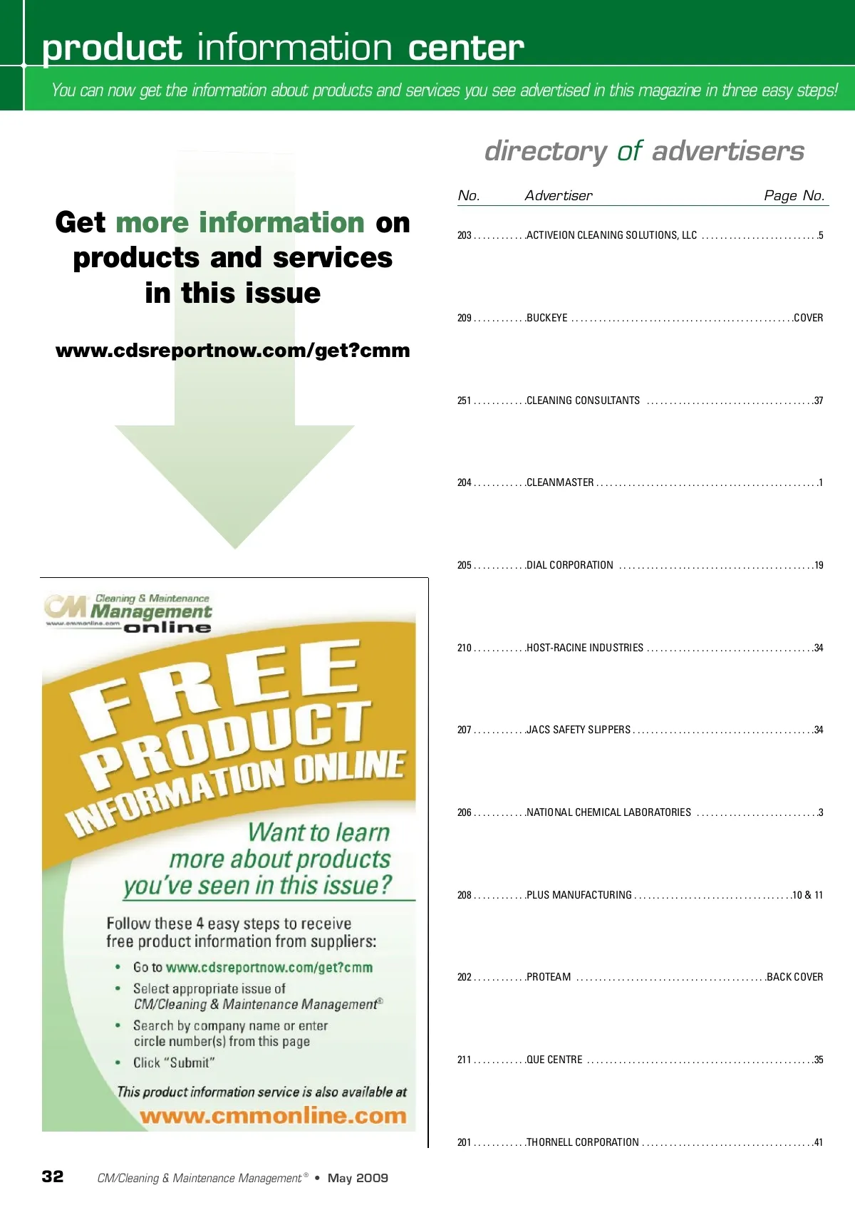 product information center You can now get the information about products and services you see advertised in this magazine in three easy steps! directory of advertisers No. Advertiser Page No. Get more information on products and services in this issue www.cdsreportnow.com/get?cmm 203 . . . . . . . . . . . .ACTIVEION CLEANING SOLUTIONS, LLC . . . . . . . . . . . . . . . . . . . . . . . . . .5 209 . . . . . . . . . . . .BUCKEYE . . . . . . . . . . . . . . . . . . . . . . . . . . . . . . . . . . . . . . . . . . . . . . . . .COVER 251 . . . . . . . . . . . .CLEANING CONSULTANTS . . . . . . . . . . . . . . . . . . . . . . . . . . . . . . . . . . . . .37 204 . . . . . . . . . . . .CLEANMASTER . . . . . . . . . . . . . . . . . . . . . . . . . . . . . . . . . . . . . . . . . . . . . . . . .1 205 . . . . . . . . . . . .DIAL CORPORATION . . . . . . . . . . . . . . . . . . . . . . . . . . . . . . . . . . . . . . . . . . .19 210 . . . . . . . . . . . .HOST-RACINE INDUSTRIES . . . . . . . . . . . . . . . . . . . . . . . . . . . . . . . . . . . . .34 207 . . . . . . . . . . . .JACS SAFETY SLIPPERS . . . . . . . . . . . . . . . . . . . . . . . . . . . . . . . . . . . . . . . .34 206 . . . . . . . . . . . .NATIONAL CHEMICAL LABORATORIES . . . . . . . . . . . . . . . . . . . . . . . . . . .3 208 . . . . . . . . . . . .PLUS MANUFACTURING . . . . . . . . . . . . . . . . . . . . . . . . . . . . . . . . . . .10 & 11 202 . . . . . . . . . . . .PROTEAM . . . . . . . . . . . . . . . . . . . . . . . . . . . . . . . . . . . . . . . . . .BACK COVER 211 . . . . . . . . . . . .QUE CENTRE . . . . . . . . . . . . . . . . . . . . . . . . . . . . . . . . . . . . . . . . . . . . . . . . . .35 201 . . . . . . . . . . . .THORNELL CORPORATION . . . . . . . . . . . . . . . . . . . . . . . . . . . . . . . . . . . . . .41 32 CM/Cleaning & Maintenance Management ® • May 2009