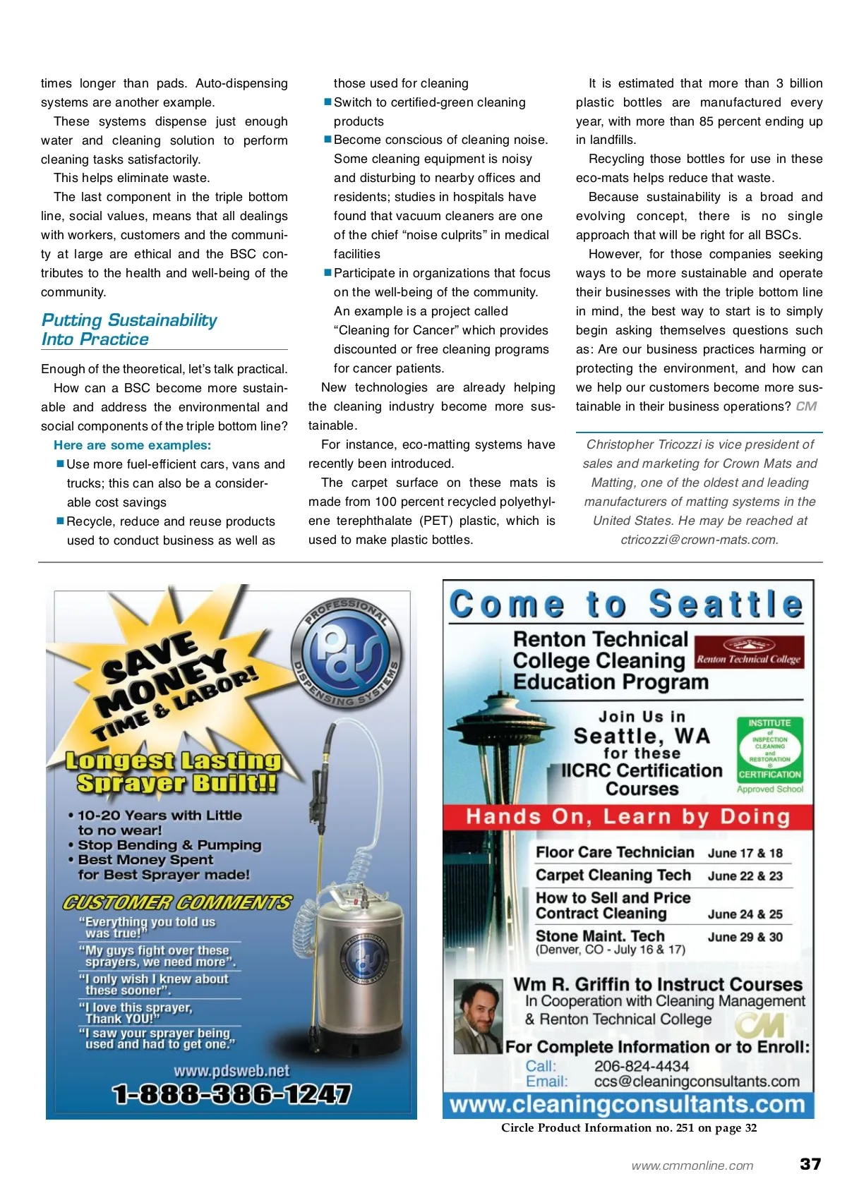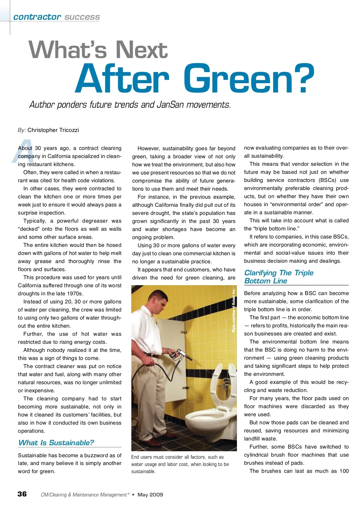 contractor success What’s Next Author ponders future trends and JanSan movements. By: Christopher Tricozzi After Green? However, sustainability goes far beyond green, taking a broader view of not only how we treat the environment, but also how we use present resources so that we do not compromise the ability of future genera-tions to use them and meet their needs. For instance, in the previous example, although California finally did pull out of its severe drought, the stateʼs population has grown significantly in the past 30 years and water shortages have become an ongoing problem. Using 30 or more gallons of water every day just to clean one commercial kitchen is no longer a sustainable practice. It appears that end customers, who have driven the need for green cleaning, are Photo courtesy of Kaivac Inc. A About 30 years ago, a contract cleaning company in California specialized in clean-ing restaurant kitchens. Often, they were called in when a restau-rant was cited for health code violations. In other cases, they were contracted to clean the kitchen one or more times per week just to ensure it would always pass a surprise inspection. Typically, a powerful degreaser was “decked” onto the floors as well as walls and some other surface areas. The entire kitchen would then be hosed down with gallons of hot water to help melt away grease and thoroughly rinse the floors and surfaces. This procedure was used for years until California suffered through one of its worst droughts in the late 1970s. Instead of using 20, 30 or more gallons of water per cleaning, the crew was limited to using only two gallons of water through-out the entire kitchen. Further, the use of hot water was restricted due to rising energy costs. Although nobody realized it at the time, this was a sign of things to come. The contract cleaner was put on notice that water and fuel, along with many other natural resources, was no longer unlimited or inexpensive. The cleaning company had to start becoming more sustainable, not only in how it cleaned its customersʼ facilities, but also in how it conducted its own business operations. now evaluating companies as to their over-all sustainability. This means that vendor selection in the future may be based not just on whether building service contractors (BSCs) use environmentally preferable cleaning prod-ucts, but on whether they have their own houses in “environmental order” and oper-ate in a sustainable manner. This will take into account what is called the “triple bottom line.” It refers to companies, in this case BSCs, which are incorporating economic, environ-mental and social-value issues into their business decision making and dealings. Clarifying The Triple Bottom Line Before analyzing how a BSC can become more sustainable, some clarification of the triple bottom line is in order. The first part — the economic bottom line — refers to profits, historically the main rea-son businesses are created and exist. The environmental bottom line means that the BSC is doing no harm to the envi-ronment — using green cleaning products and taking significant steps to help protect the environment. A good example of this would be recy-cling and waste reduction. For many years, the floor pads used on floor machines were discarded as they were used. But now those pads can be cleaned and reused, saving resources and minimizing landfill waste. Further, some BSCs have switched to cylindrical brush floor machines that use brushes instead of pads. The brushes can last as much as 100 What Is Sustainable? Sustainable has become a buzzword as of late, and many believe it is simply another word for green. End users must consider all factors, such as water usage and labor cost, when looking to be sustainable. 36 CM/Cleaning & Maintenance Management ® • May 2009