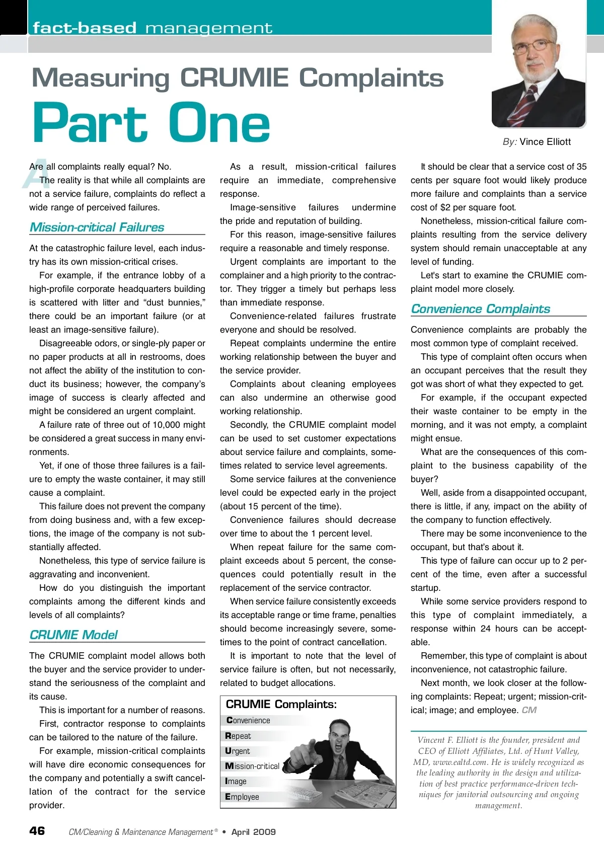fact-based management Measuring CRUMIE Complaints Part One A Are all complaints really equal? No. The reality is that while all complaints are not a service failure, complaints do reflect a wide range of perceived failures. By: Vince Elliott It should be clear that a service cost of 35 cents per square foot would likely produce more failure and complaints than a service cost of $2 per square foot. Nonetheless, mission-critical failure com-plaints resulting from the service delivery system should remain unacceptable at any level of funding. Let's start to examine the CRUMIE com-plaint model more closely. Mission-critical Failures At the catastrophic failure level, each indus-try has its own mission-critical crises. For example, if the entrance lobby of a high-profile corporate headquarters building is scattered with litter and “dust bunnies,” there could be an important failure (or at least an image-sensitive failure). Disagreeable odors, or single-ply paper or no paper products at all in restrooms, does not affect the ability of the institution to con-duct its business; however, the companyʼs image of success is clearly affected and might be considered an urgent complaint. A failure rate of three out of 10,000 might be considered a great success in many envi-ronments. Yet, if one of those three failures is a fail-ure to empty the waste container, it may still cause a complaint. This failure does not prevent the company from doing business and, with a few excep-tions, the image of the company is not sub-stantially affected. Nonetheless, this type of service failure is aggravating and inconvenient. How do you distinguish the important complaints among the different kinds and levels of all complaints? CRUMIE Model The CRUMIE complaint model allows both the buyer and the service provider to under-stand the seriousness of the complaint and its cause. This is important for a number of reasons. First, contractor response to complaints can be tailored to the nature of the failure. For example, mission-critical complaints will have dire economic consequences for the company and potentially a swift cancel-lation of the contract for the service provider. As a result, mission-critical failures require an immediate, comprehensive response. Image-sensitive failures undermine the pride and reputation of building. For this reason, image-sensitive failures require a reasonable and timely response. Urgent complaints are important to the complainer and a high priority to the contrac-tor. They trigger a timely but perhaps less than immediate response. Convenience-related failures frustrate everyone and should be resolved. Repeat complaints undermine the entire working relationship between the buyer and the service provider. Complaints about cleaning employees can also undermine an otherwise good working relationship. Secondly, the CRUMIE complaint model can be used to set customer expectations about service failure and complaints, some-times related to service level agreements. Some service failures at the convenience level could be expected early in the project (about 15 percent of the time). Convenience failures should decrease over time to about the 1 percent level. When repeat failure for the same com-plaint exceeds about 5 percent, the conse-quences could potentially result in the replacement of the service contractor. When service failure consistently exceeds its acceptable range or time frame, penalties should become increasingly severe, some-times to the point of contract cancellation. It is important to note that the level of service failure is often, but not necessarily, related to budget allocations. Convenience Complaints Convenience complaints are probably the most common type of complaint received. This type of complaint often occurs when an occupant perceives that the result they got was short of what they expected to get. For example, if the occupant expected their waste container to be empty in the morning, and it was not empty, a complaint might ensue. What are the consequences of this com-plaint to the business capability of the buyer? Well, aside from a disappointed occupant, there is little, if any, impact on the ability of the company to function effectively. There may be some inconvenience to the occupant, but thatʼs about it. This type of failure can occur up to 2 per-cent of the time, even after a successful startup. While some service providers respond to this type of complaint immediately, a response within 24 hours can be accept-able. Remember, this type of complaint is about inconvenience, not catastrophic failure. Next month, we look closer at the follow-ing complaints: Repeat; urgent; mission-crit-ical; image; and employee. CM Vincent F. Elliott is the founder, president and CEO of Elliott Affiliates, Ltd. of Hunt Valley, MD, www.ealtd.com. He is widely recognized as the leading authority in the design and utiliza-tion of best practice performance-driven tech-niques for janitorial outsourcing and ongoing management. CRUMIE Complaints: C onvenience R epeat U rgent M ission-critical I mage E mployee 46 CM/Cleaning & Maintenance Management ® • April 2009