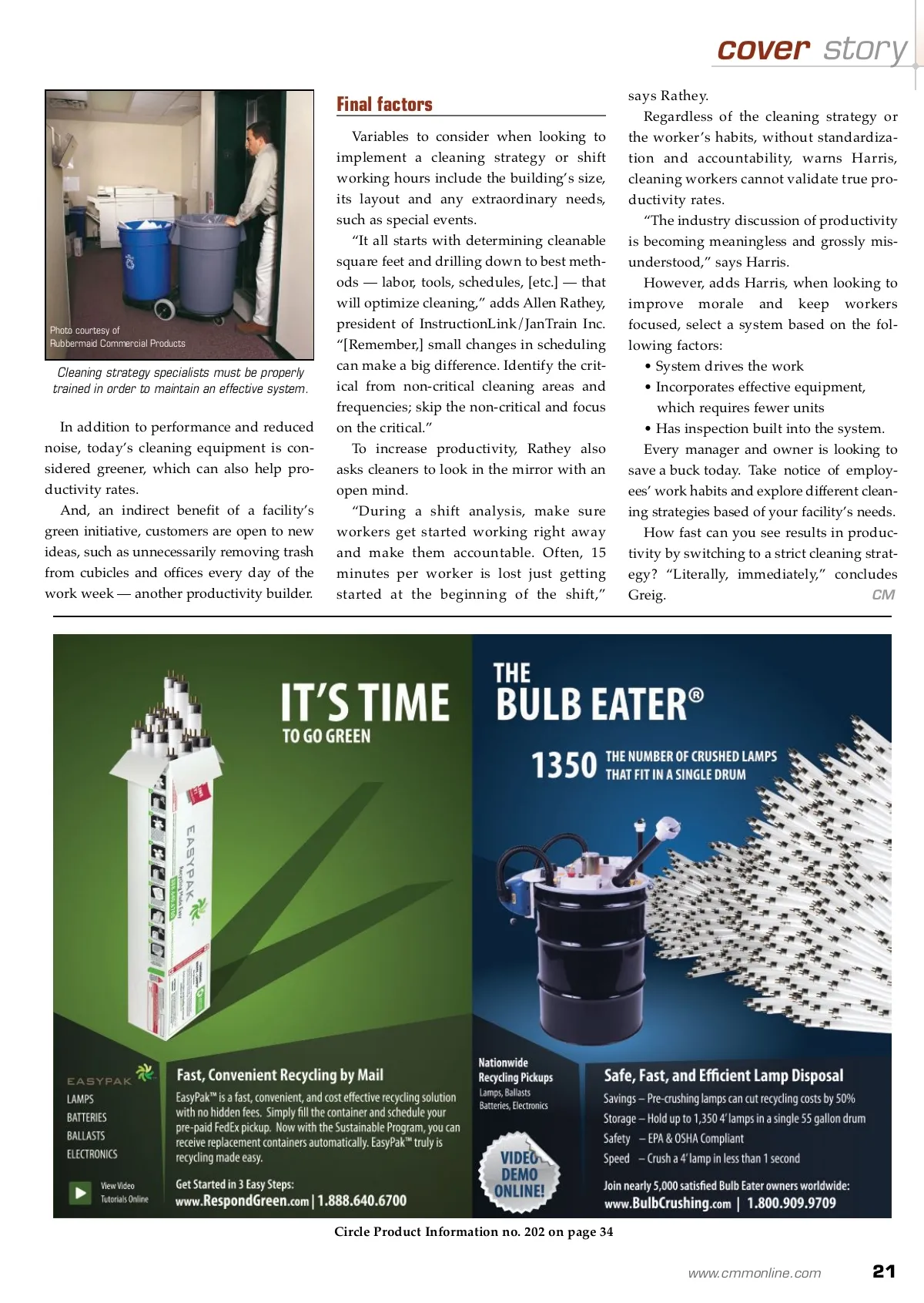 cover story Continued from prior page many years ago when end users were satis-fied with cleaning 1,600 square feet an hour. Day versus Night For years, the preferred cleaning hours in commercial cleaning were during the night. However, this preference is changing. “If for no other reason, [Day Cleaning] can save building owners money due to less electrical costs,” says Parillo. “Keeping a building up and running 24 hours per day is getting more and more costly, espe-cially when half of those 24 hours is just to keep the lights, HVAC systems and other building mechanicals running for the cleaning staff.” Greig notices other benefits that can result in additional cost savings. In an office setting, for example, daytime cleaners often develop a rapport with the building’s occupants and visitors. This achieves cost savings in several ways, including: • Communication lines remain open • The cleaner better understands each individual’s cleaning needs • The cleaner is kept abreast of new and terminated employees, which might add or subtract to the workload • Building occupants are more inclined to pick up after themselves. “Unfortunately, there are huge layoffs [happening in corporate America] today,” asserts Greig. “The night cleaner might have no idea that Mary isn’t working in her cubicle any more and can come back to the client with a revised [fee] based on requirement.” This communication also greatly impacts worker productivity. “During a shift analysis, make sure workers get started working right away and make them accountable.” – Allen Rathey The labor issue and notable trends Labor is a BSC’s or in-house manager’s number one cost factor. And, since better products and more effi-cient equipment are available, these man-agers and owners can now look to reverse the trend. “We are an 80 percent labor-intent busi-ness, with six to eight percent for equip-ment,” says Greig, who notes that this ratio is unmatched in any industry. “We have to look at equipment replacing labor and rais-ing the amount of equipment used and lowering the amount of labor required. Historically, we have not done that.” Certifiably green. Undeniably clean. The HOST ® Dry Carpet Cleaning System is the undeniable choice for green carpet cleaning. Superior results that save time, water and energy. A healthier environment inside and a greener one outside. HOST is the greenest way to clean your carpet – period. To see for yourself, call 800-558-9439 or visit www.hostdry.com © 2008 Racine Industries Circle Product Information no. 205 on page 34 Circle Product Information no. 213 on page 34 20 CM/Cleaning & Maintenance Management ® • March 2009