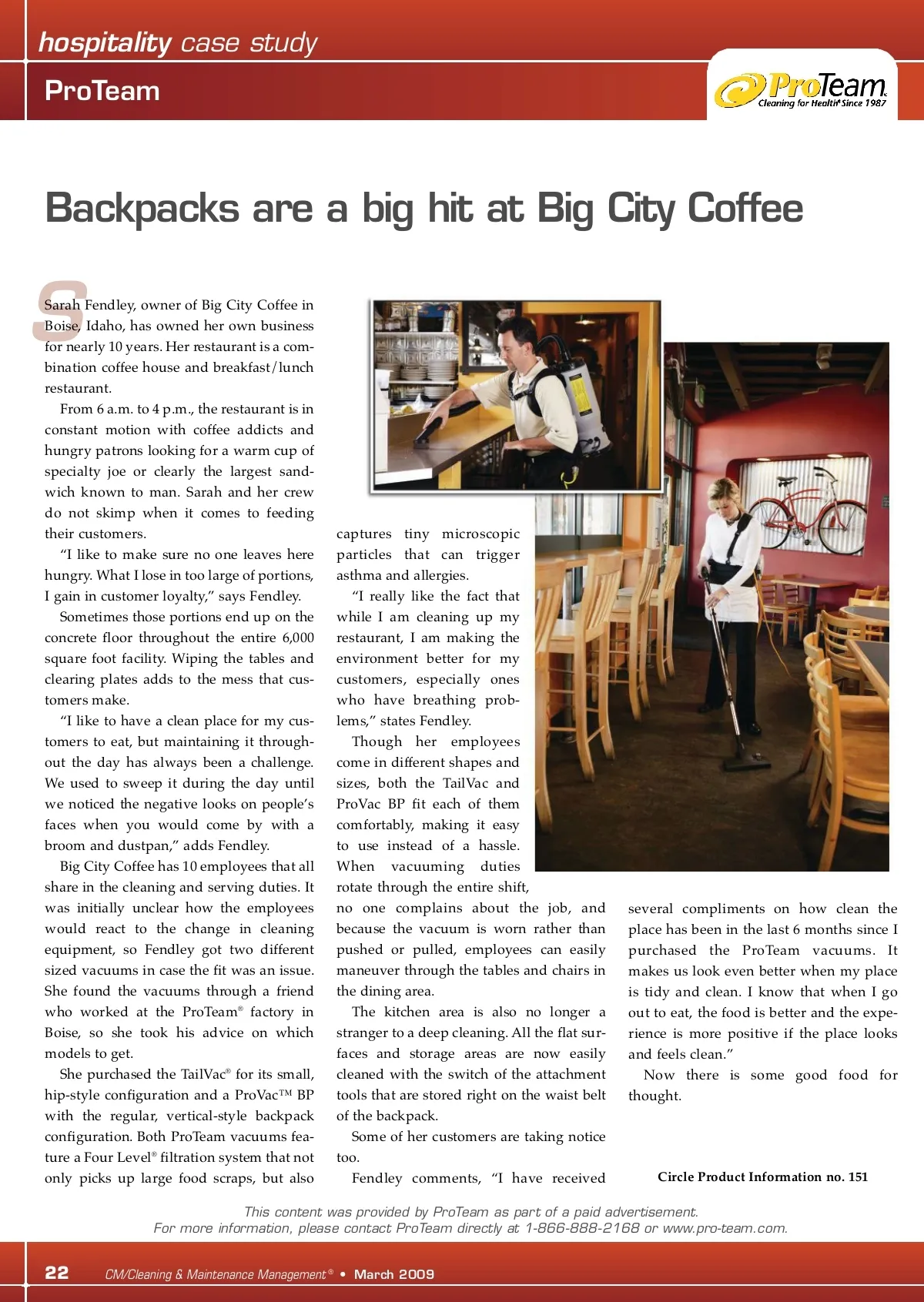 hospitality case study ProTeam Backpacks are a big hit at Big City Coffee S Sarah Fendley, owner of Big City Coffee in Boise, Idaho, has owned her own business for nearly 10 years. Her restaurant is a com-bination coffee house and breakfast/lunch restaurant. From 6 a.m. to 4 p.m., the restaurant is in constant motion with coffee addicts and hungry patrons looking for a warm cup of specialty joe or clearly the largest sand-wich known to man. Sarah and her crew do not skimp when it comes to feeding their customers. “I like to make sure no one leaves here hungry. What I lose in too large of portions, I gain in customer loyalty,” says Fendley. Sometimes those portions end up on the concrete floor throughout the entire 6,000 square foot facility. Wiping the tables and clearing plates adds to the mess that cus-tomers make. “I like to have a clean place for my cus-tomers to eat, but maintaining it through-out the day has always been a challenge. We used to sweep it during the day until we noticed the negative looks on people’s faces when you would come by with a broom and dustpan,” adds Fendley. Big City Coffee has 10 employees that all share in the cleaning and serving duties. It was initially unclear how the employees would react to the change in cleaning equipment, so Fendley got two different sized vacuums in case the fit was an issue. She found the vacuums through a friend who worked at the ProTeam ® factory in Boise, so she took his advice on which models to get. She purchased the TailVac ® for its small, hip-style configuration and a ProVac™ BP with the regular, vertical-style backpack configuration. Both ProTeam vacuums fea-ture a Four Level ® filtration system that not only picks up large food scraps, but also captures tiny microscopic particles that can trigger asthma and allergies. “I really like the fact that while I am cleaning up my restaurant, I am making the environment better for my customers, especially ones who have breathing prob-lems,” states Fendley. Though her employees come in different shapes and sizes, both the TailVac and ProVac BP fit each of them comfortably, making it easy to use instead of a hassle. When vacuuming duties rotate through the entire shift, no one complains about the job, and because the vacuum is worn rather than pushed or pulled, employees can easily maneuver through the tables and chairs in the dining area. The kitchen area is also no longer a stranger to a deep cleaning. All the flat sur-faces and storage areas are now easily cleaned with the switch of the attachment tools that are stored right on the waist belt of the backpack. Some of her customers are taking notice too. Fendley comments, “I have received several compliments on how clean the place has been in the last 6 months since I purchased the ProTeam vacuums. It makes us look even better when my place is tidy and clean. I know that when I go out to eat, the food is better and the expe-rience is more positive if the place looks and feels clean.” Now there is some good food for thought. Circle Product Information no. 151 This content was provided by ProTeam as part of a paid advertisement. For more information, please contact ProTeam directly at 1-866-888-2168 or www.pro-team.com. 22 CM/Cleaning & Maintenance Management ® • March 2009