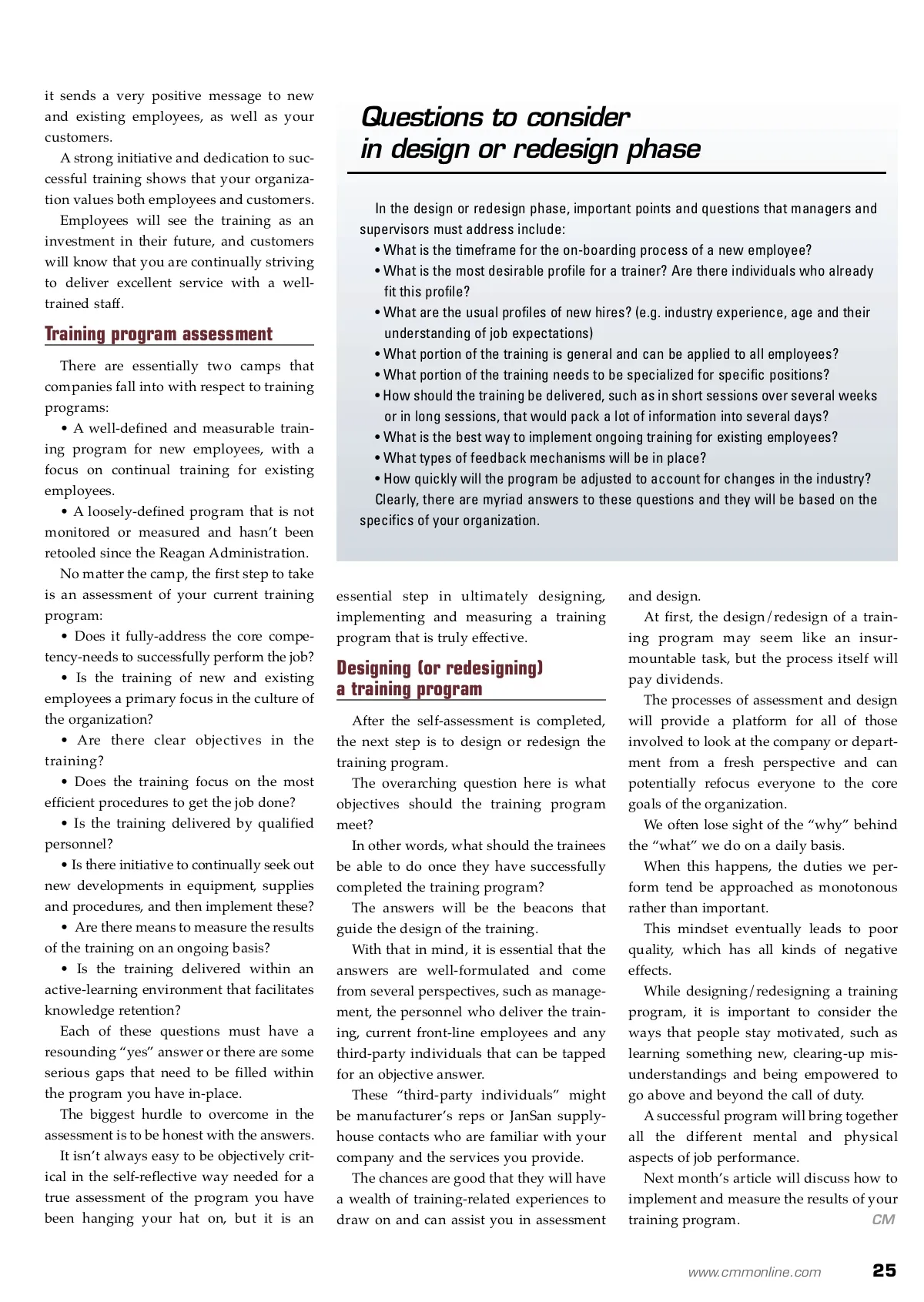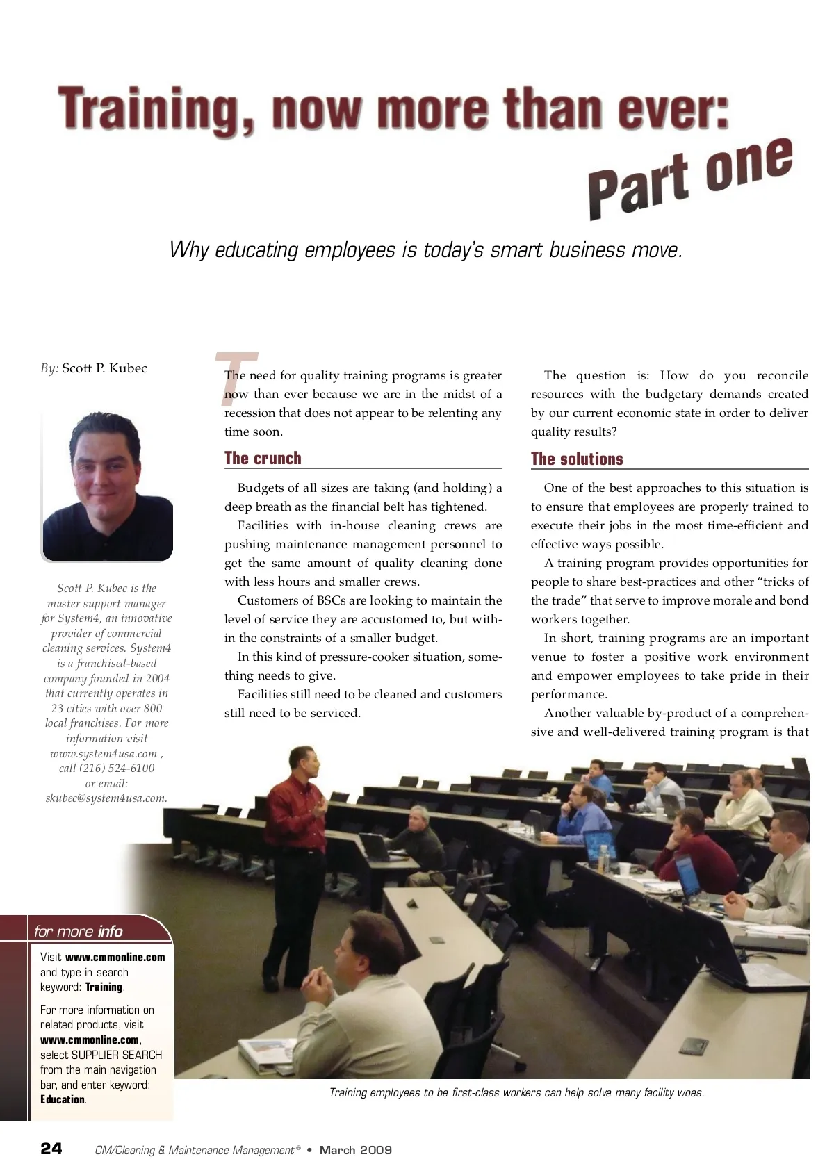 Why educating employees is today’s smart business move. By: Scott P. Kubec T The need for quality training programs is greater now than ever because we are in the midst of a recession that does not appear to be relenting any time soon. The question is: How do you reconcile resources with the budgetary demands created by our current economic state in order to deliver quality results? The crunch Budgets of all sizes are taking (and holding) a deep breath as the financial belt has tightened. Facilities with in-house cleaning crews are pushing maintenance management personnel to get the same amount of quality cleaning done with less hours and smaller crews. Customers of BSCs are looking to maintain the level of service they are accustomed to, but with-in the constraints of a smaller budget. In this kind of pressure-cooker situation, some-thing needs to give. Facilities still need to be cleaned and customers still need to be serviced. The solutions One of the best approaches to this situation is to ensure that employees are properly trained to execute their jobs in the most time-efficient and effective ways possible. A training program provides opportunities for people to share best-practices and other “tricks of the trade” that serve to improve morale and bond workers together. In short, training programs are an important venue to foster a positive work environment and empower employees to take pride in their performance. Another valuable by-product of a comprehen-sive and well-delivered training program is that Scott P. Kubec is the master support manager for System4, an innovative provider of commercial cleaning services. System4 is a franchised-based company founded in 2004 that currently operates in 23 cities with over 800 local franchises. For more information visit www.system4usa.com , call (216) 524-6100 or email: [email protected]. for more info Visit www.cmmonline.com and type in search keyword: Training . For more information on related products, visit www.cmmonline.com , select SUPPLIER SEARCH from the main navigation bar, and enter keyword: Education . Training employees to be first-class workers can help solve many facility woes. 24 CM/Cleaning & Maintenance Management ® • March 2009