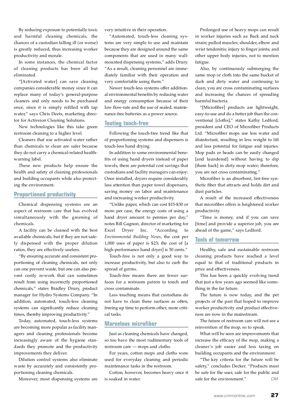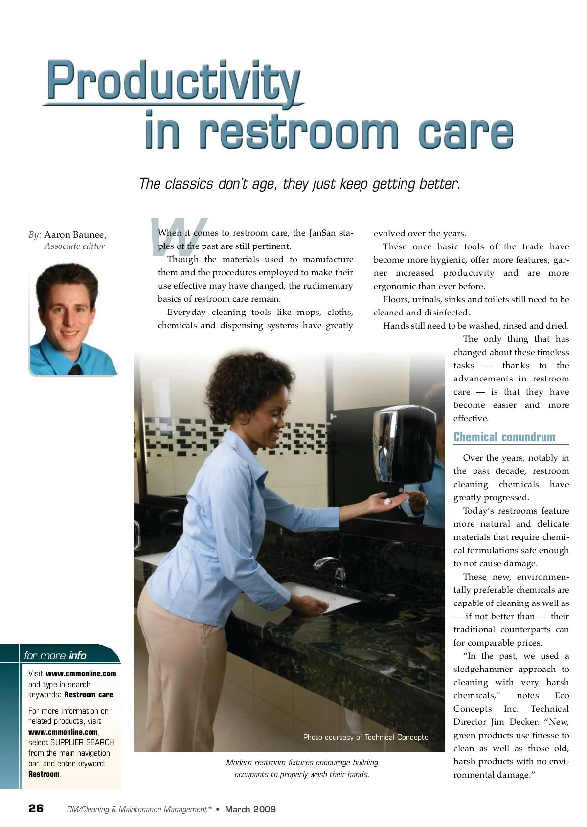 The classics don’t age, they just keep getting better. By: Aaron Baunee, Associate editor W When it comes to restroom care, the JanSan sta-ples of the past are still pertinent. Though the materials used to manufacture them and the procedures employed to make their use effective may have changed, the rudimentary basics of restroom care remain. Everyday cleaning tools like mops, cloths, chemicals and dispensing systems have greatly evolved over the years. These once basic tools of the trade have become more hygienic, offer more features, gar-ner increased productivity and are more ergonomic than ever before. Floors, urinals, sinks and toilets still need to be cleaned and disinfected. Hands still need to be washed, rinsed and dried. The only thing that has changed about these timeless tasks — thanks to the advancements in restroom care — is that they have become easier and more effective. Chemical conundrum Over the years, notably in the past decade, restroom cleaning chemicals have greatly progressed. Today’s restrooms feature more natural and delicate materials that require chemi-cal formulations safe enough to not cause damage. These new, environmen-tally preferable chemicals are capable of cleaning as well as — if not better than — their traditional counterparts can for comparable prices. “In the past, we used a sledgehammer approach to cleaning with very harsh chemicals,” notes Eco Concepts Inc. Technical Director Jim Decker. “New, green products use finesse to clean as well as those old, harsh products with no envi-ronmental damage.” for more info Visit www.cmmonline.com and type in search keywords: Restroom care . For more information on related products, visit www.cmmonline.com , select SUPPLIER SEARCH from the main navigation bar, and enter keyword: Restroom . Photo courtesy of Technical Concepts Modern restroom fixtures encourage building occupants to properly wash their hands. 26 CM/Cleaning & Maintenance Management ® • March 2009