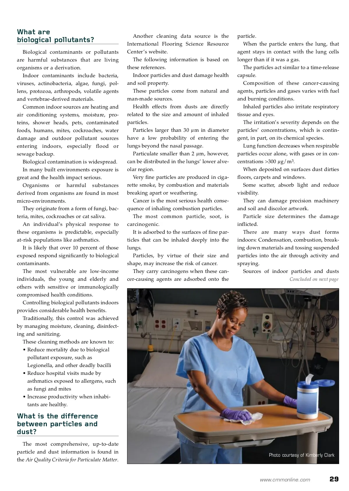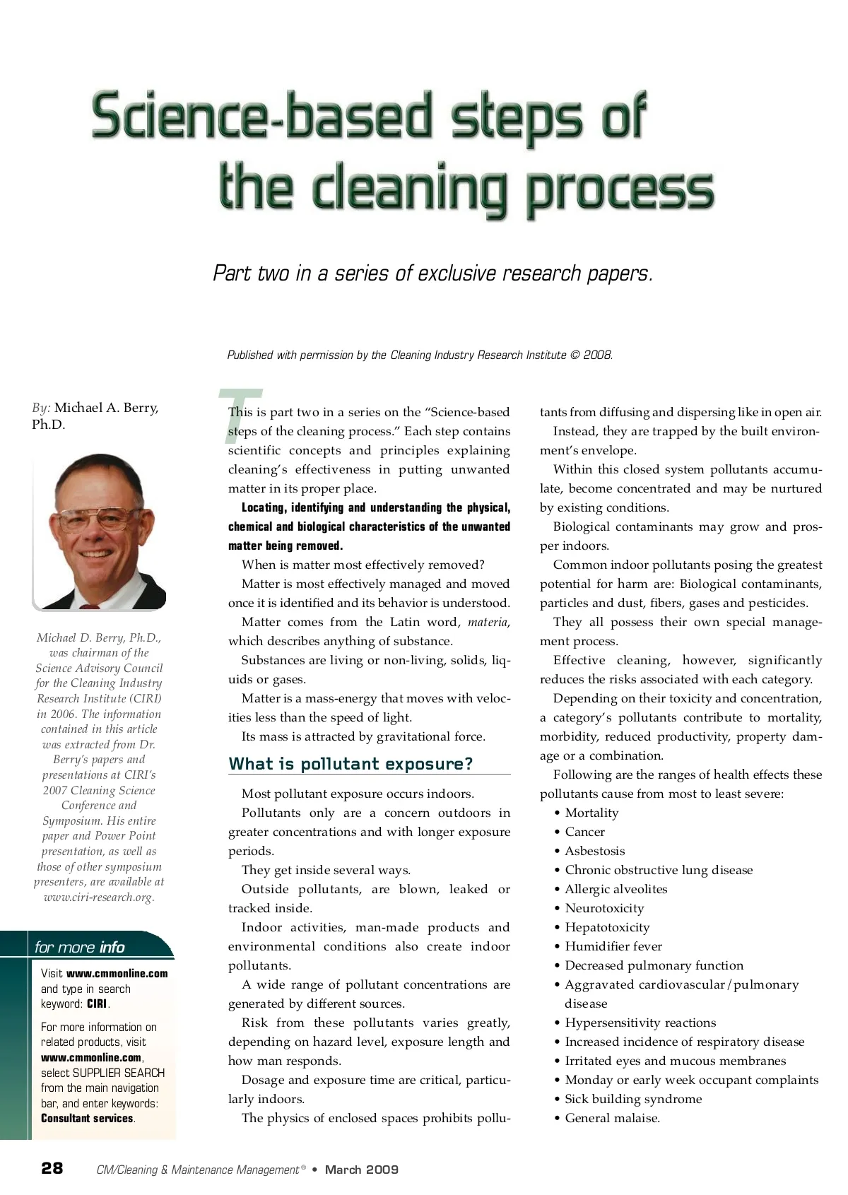 Part two in a series of exclusive research papers. Published with permission by the Cleaning Industry Research Institute © 2008. By: Michael A. Berry, Ph.D. T Michael D. Berry, Ph.D., was chairman of the Science Advisory Council for the Cleaning Industry Research Institute (CIRI) in 2006. The information contained in this article was extracted from Dr. Berry’s papers and presentations at CIRI’s 2007 Cleaning Science Conference and Symposium. His entire paper and Power Point presentation, as well as those of other symposium presenters, are available at www.ciri-research.org. This is part two in a series on the “Science-based steps of the cleaning process.” Each step contains scientific concepts and principles explaining cleaning’s effectiveness in putting unwanted matter in its proper place. Locating, identifying and understanding the physical, chemical and biological characteristics of the unwanted matter being removed. When is matter most effectively removed? Matter is most effectively managed and moved once it is identified and its behavior is understood. Matter comes from the Latin word, materia , which describes anything of substance. Substances are living or non-living, solids, liq-uids or gases. Matter is a mass-energy that moves with veloc-ities less than the speed of light. Its mass is attracted by gravitational force. What is pollutant exposure? Most pollutant exposure occurs indoors. Pollutants only are a concern outdoors in greater concentrations and with longer exposure periods. They get inside several ways. Outside pollutants, are blown, leaked or tracked inside. Indoor activities, man-made products and environmental conditions also create indoor pollutants. A wide range of pollutant concentrations are generated by different sources. Risk from these pollutants varies greatly, depending on hazard level, exposure length and how man responds. Dosage and exposure time are critical, particu-larly indoors. The physics of enclosed spaces prohibits pollu-for more info Visit www.cmmonline.com and type in search keyword: CIRI . For more information on related products, visit www.cmmonline.com , select SUPPLIER SEARCH from the main navigation bar, and enter keywords: Consultant services . tants from diffusing and dispersing like in open air. Instead, they are trapped by the built environ-ment’s envelope. Within this closed system pollutants accumu-late, become concentrated and may be nurtured by existing conditions. Biological contaminants may grow and pros-per indoors. Common indoor pollutants posing the greatest potential for harm are: Biological contaminants, particles and dust, fibers, gases and pesticides. They all possess their own special manage-ment process. Effective cleaning, however, significantly reduces the risks associated with each category. Depending on their toxicity and concentration, a category’s pollutants contribute to mortality, morbidity, reduced productivity, property dam-age or a combination. Following are the ranges of health effects these pollutants cause from most to least severe: • Mortality • Cancer • Asbestosis • Chronic obstructive lung disease • Allergic alveolites • Neurotoxicity • Hepatotoxicity • Humidifier fever • Decreased pulmonary function • Aggravated cardiovascular/pulmonary disease • Hypersensitivity reactions • Increased incidence of respiratory disease • Irritated eyes and mucous membranes • Monday or early week occupant complaints • Sick building syndrome • General malaise. 28 CM/Cleaning & Maintenance Management ® • March 2009