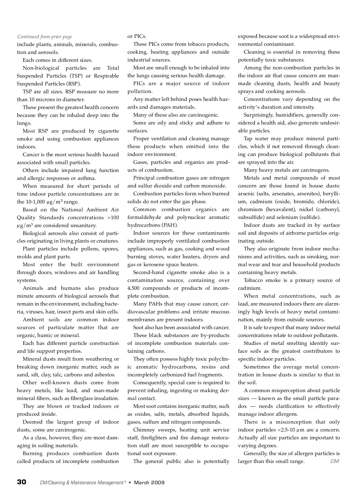 Continued from prior page include plants, animals, minerals, combus-tion and aerosols. Each comes in different sizes. Non-biological particles are Total Suspended Particles (TSP) or Respirable Suspended Particles (RSP). TSP are all sizes. RSP measure no more than 10 microns in diameter. These present the greatest health concern because they can be inhaled deep into the lungs. Most RSP are produced by cigarette smoke and using combustion appliances indoors. Cancer is the most serious health hazard associated with small particles. Others include impaired lung function and allergic responses or asthma. When measured for short periods of time indoor particle concentrations are in the 10-1,000 µg/m 3 range. Based on the National Ambient Air Quality Standards concentrations >100 µg/m 3 are considered unsanitary. Biological aerosols also consist of parti-cles originating in living plants or creatures. Plant particles include pollens, spores, molds and plant parts. Most enter the built environment through doors, windows and air handling systems. Animals and humans also produce minute amounts of biological aerosols that remain in the environment, including bacte-ria, viruses, hair, insect parts and skin cells. Ambient soils are common indoor sources of particulate matter that are organic, humic or mineral. Each has different particle construction and life support properties. Mineral dusts result from weathering or breaking down inorganic matter, such as sand, silt, clay, talc, carbons and asbestos. Other well-known dusts come from heavy metals, like lead, and man-made mineral fibers, such as fiberglass insulation. They are blown or tracked indoors or produced inside. Deemed the largest group of indoor dusts, some are carcinogenic. As a class, however, they are most dam-aging in soiling materials. Burning produces combustion dusts called products of incomplete combustion or PICs. These PICs come from tobacco products, cooking, heating appliances and outside industrial sources. Most are small enough to be inhaled into the lungs causing serious health damage. PICs are a major source of indoor pollution. Any matter left behind poses health haz-ards and damages materials. Many of these also are carcinogenic. Some are oily and sticky and adhere to surfaces. Proper ventilation and cleaning manage these products when emitted into the indoor environment. Gases, particles and organics are prod-ucts of combustion. Principal combustion gases are nitrogen and sulfur dioxide and carbon monoxide. Combustion particles form when burned solids do not enter the gas phase. Common combustion organics are formaldehyde and polynuclear aromatic hydrocarbons (PAH). Indoor sources for these contaminants include improperly ventilated combustion appliances, such as gas, cooking and wood burning stoves, water heaters, dryers and gas or kerosene space heaters. Second-hand cigarette smoke also is a contamination source, containing over 4,500 compounds or products of incom-plete combustion. Many PAHs that may cause cancer, car-diovascular problems and irritate mucous membranes are present indoors. Soot also has been associated with cancer. These black substances are by-products of incomplete combustion materials con-taining carbons. They often possess highly toxic polyclin-ic aromatic hydrocarbons, resins and incompletely carbonized fuel fragments. Consequently, special care is required to prevent inhaling, ingesting or making der-mal contact. Most soot contains inorganic matter, such as oxides, salts, metals, absorbed liquids, gases, sulfurs and nitrogen compounds. Chimney sweeps, heating unit service staff, firefighters and fire damage restora-tion staff are most susceptible to occupa-tional soot exposure. The general public also is potentially exposed because soot is a widespread envi-ronmental contaminant. Cleaning is essential in removing these potentially toxic substances. Among the non-combustion particles in the indoor air that cause concern are man-made cleaning dusts, health and beauty sprays and cooking aerosols. Concentrations vary depending on the activity’s duration and intensity. Surprisingly, humidifiers, generally con-sidered a health aid, also generate undesir-able particles. Tap water may produce mineral parti-cles, which if not removed through clean-ing can produce biological pollutants that are sprayed into the air. Many heavy metals are carcinogens. Metals and metal compounds of most concern are those found in house dusts: arsenic (salts, arsenates, arsenites), berylli-um, cadmium (oxide, bromide, chloride), chromium (hexavalent), nickel (carbonyl, subsulfide) and selenium (sulfide). Indoor dusts are tracked in by surface soil and deposits of airborne particles orig-inating outside. They also originate from indoor mecha-nisms and activities, such as smoking, nor-mal wear and tear and household products containing heavy metals. Tobacco smoke is a primary source of cadmium. When metal concentrations, such as lead, are measured indoors there are alarm-ingly high levels of heavy metal contami-nation, mainly from outside sources. It is safe to expect that many indoor metal concentrations relate to outdoor pollutants. Studies of metal smelting identify sur-face soils as the greatest contributors to specific indoor particles. Sometimes the average metal concen-tration in house dusts is similar to that in the soil. A common misperception about particle sizes — known as the small particle para-dox — needs clarification to effectively manage indoor allergens. There is a misconception that only indoor particles <2.5-10 µm are a concern. Actually all size particles are important to varying degrees. Generally, the size of allergen particles is CM larger than this small range. 30 CM/Cleaning & Maintenance Management ® • March 2009