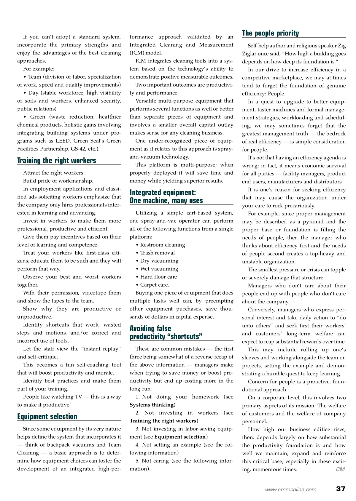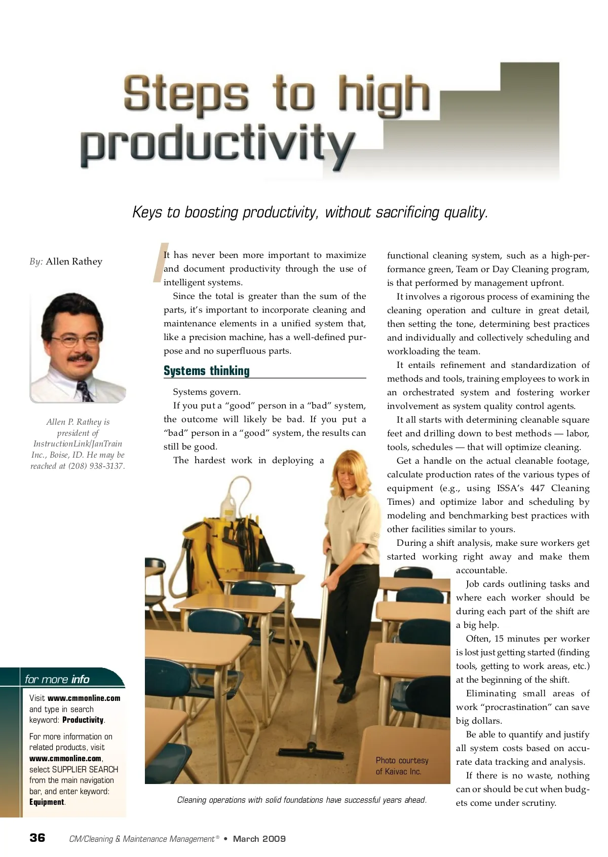 Keys to boosting productivity, without sacrificing quality. By: Allen Rathey I It has never been more important to maximize and document productivity through the use of intelligent systems. Since the total is greater than the sum of the parts, it’s important to incorporate cleaning and maintenance elements in a unified system that, like a precision machine, has a well-defined pur-pose and no superfluous parts. Allen P. Rathey is president of InstructionLink/JanTrain Inc., Boise, ID. He may be reached at (208) 938-3137. for more info Visit www.cmmonline.com and type in search keyword: Productivity . For more information on related products, visit www.cmmonline.com , select SUPPLIER SEARCH from the main navigation bar, and enter keyword: Equipment . functional cleaning system, such as a high-per-formance green, Team or Day Cleaning program, is that performed by management upfront. It involves a rigorous process of examining the cleaning operation and culture in great detail, then setting the tone, determining best practices and individually and collectively scheduling and workloading the team. It entails refinement and standardization of Systems thinking methods and tools, training employees to work in Systems govern. an orchestrated system and fostering worker If you put a “good” person in a “bad” system, involvement as system quality control agents. the outcome will likely be bad. If you put a It all starts with determining cleanable square “bad” person in a “good” system, the results can feet and drilling down to best methods — labor, still be good. tools, schedules — that will optimize cleaning. The hardest work in deploying a Get a handle on the actual cleanable footage, calculate production rates of the various types of equipment (e.g., using ISSA’s 447 Cleaning Times) and optimize labor and scheduling by modeling and benchmarking best practices with other facilities similar to yours. During a shift analysis, make sure workers get started working right away and make them accountable. Job cards outlining tasks and where each worker should be during each part of the shift are a big help. Often, 15 minutes per worker is lost just getting started (finding tools, getting to work areas, etc.) at the beginning of the shift. Eliminating small areas of work “procrastination” can save big dollars. Be able to quantify and justify all system costs based on accu-Photo courtesy rate data tracking and analysis. of Kaivac Inc. If there is no waste, nothing can or should be cut when budg-Cleaning operations with solid foundations have successful years ahead. ets come under scrutiny. 36 CM/Cleaning & Maintenance Management ® • March 2009