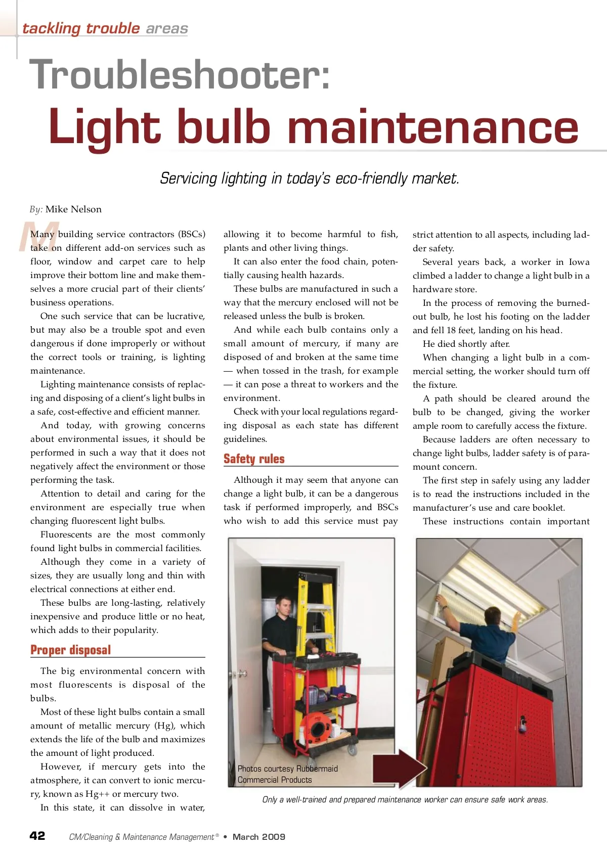 tackling trouble areas Troubleshooter: Light bulb maintenance Servicing lighting in today’s eco-friendly market. By: Mike Nelson M Many building service contractors (BSCs) take on different add-on services such as floor, window and carpet care to help improve their bottom line and make them-selves a more crucial part of their clients’ business operations. One such service that can be lucrative, but may also be a trouble spot and even dangerous if done improperly or without the correct tools or training, is lighting maintenance. Lighting maintenance consists of replac-ing and disposing of a client’s light bulbs in a safe, cost-effective and efficient manner. And today, with growing concerns about environmental issues, it should be performed in such a way that it does not negatively affect the environment or those performing the task. Attention to detail and caring for the environment are especially true when changing fluorescent light bulbs. Fluorescents are the most commonly found light bulbs in commercial facilities. Although they come in a variety of sizes, they are usually long and thin with electrical connections at either end. These bulbs are long-lasting, relatively inexpensive and produce little or no heat, which adds to their popularity. allowing it to become harmful to fish, plants and other living things. It can also enter the food chain, poten-tially causing health hazards. These bulbs are manufactured in such a way that the mercury enclosed will not be released unless the bulb is broken. And while each bulb contains only a small amount of mercury, if many are disposed of and broken at the same time — when tossed in the trash, for example — it can pose a threat to workers and the environment. Check with your local regulations regard-ing disposal as each state has different guidelines. Safety rules Although it may seem that anyone can change a light bulb, it can be a dangerous task if performed improperly, and BSCs who wish to add this service must pay strict attention to all aspects, including lad-der safety. Several years back, a worker in Iowa climbed a ladder to change a light bulb in a hardware store. In the process of removing the burned-out bulb, he lost his footing on the ladder and fell 18 feet, landing on his head. He died shortly after. When changing a light bulb in a com-mercial setting, the worker should turn off the fixture. A path should be cleared around the bulb to be changed, giving the worker ample room to carefully access the fixture. Because ladders are often necessary to change light bulbs, ladder safety is of para-mount concern. The first step in safely using any ladder is to read the instructions included in the manufacturer’s use and care booklet. These instructions contain important Proper disposal The big environmental concern with most fluorescents is disposal of the bulbs. Most of these light bulbs contain a small amount of metallic mercury (Hg), which extends the life of the bulb and maximizes the amount of light produced. However, if mercury gets into the atmosphere, it can convert to ionic mercu-ry, known as Hg++ or mercury two. In this state, it can dissolve in water, Photos courtesy Rubbermaid Commercial Products Only a well-trained and prepared maintenance worker can ensure safe work areas. 42 CM/Cleaning & Maintenance Management ® • March 2009