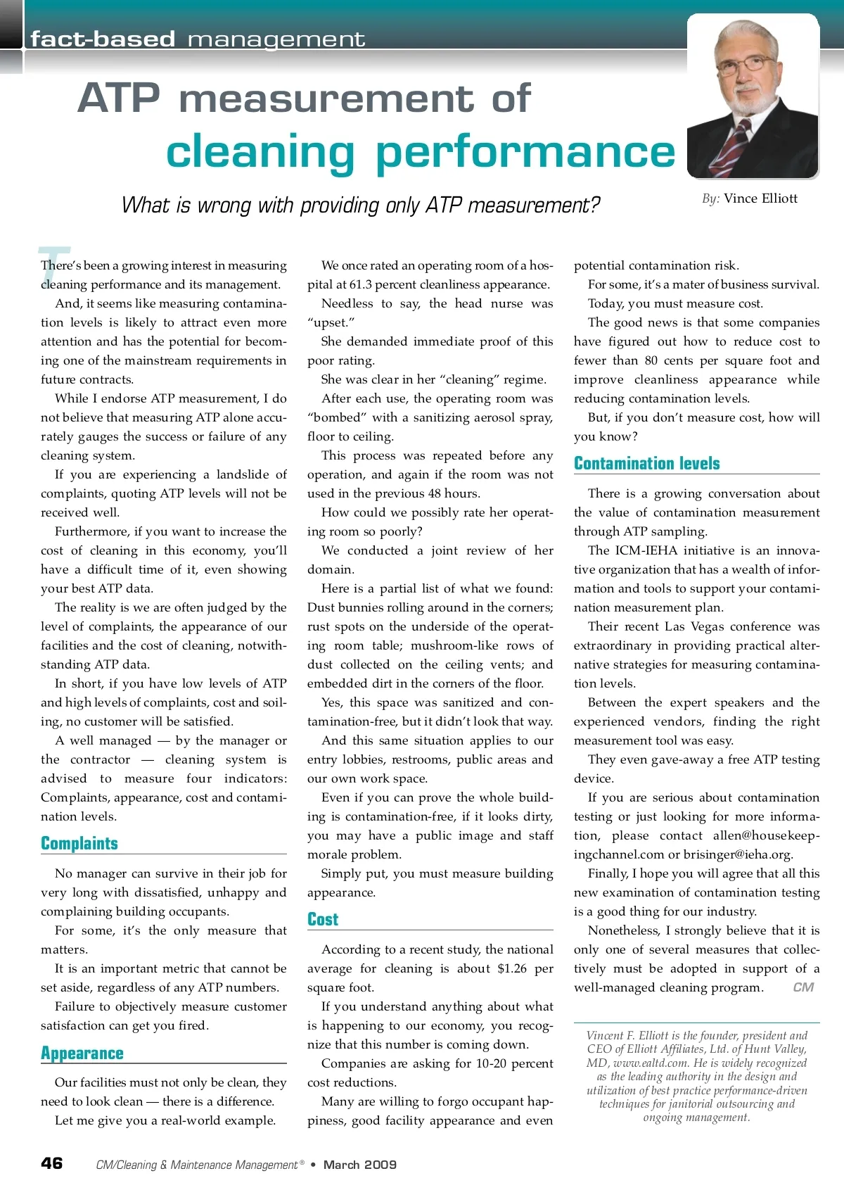 fact-based management ATP measurement of cleaning performance What is wrong with providing only ATP measurement? By: Vince Elliott T There’s been a growing interest in measuring cleaning performance and its management. And, it seems like measuring contamina-tion levels is likely to attract even more attention and has the potential for becom-ing one of the mainstream requirements in future contracts. While I endorse ATP measurement, I do not believe that measuring ATP alone accu-rately gauges the success or failure of any cleaning system. If you are experiencing a landslide of complaints, quoting ATP levels will not be received well. Furthermore, if you want to increase the cost of cleaning in this economy, you’ll have a difficult time of it, even showing your best ATP data. The reality is we are often judged by the level of complaints, the appearance of our facilities and the cost of cleaning, notwith-standing ATP data. In short, if you have low levels of ATP and high levels of complaints, cost and soil-ing, no customer will be satisfied. A well managed — by the manager or the contractor — cleaning system is advised to measure four indicators: Complaints, appearance, cost and contami-nation levels. Complaints No manager can survive in their job for very long with dissatisfied, unhappy and complaining building occupants. For some, it’s the only measure that matters. It is an important metric that cannot be set aside, regardless of any ATP numbers. Failure to objectively measure customer satisfaction can get you fired. We once rated an operating room of a hos-pital at 61.3 percent cleanliness appearance. Needless to say, the head nurse was “upset.” She demanded immediate proof of this poor rating. She was clear in her “cleaning” regime. After each use, the operating room was “bombed” with a sanitizing aerosol spray, floor to ceiling. This process was repeated before any operation, and again if the room was not used in the previous 48 hours. How could we possibly rate her operat-ing room so poorly? We conducted a joint review of her domain. Here is a partial list of what we found: Dust bunnies rolling around in the corners; rust spots on the underside of the operat-ing room table; mushroom-like rows of dust collected on the ceiling vents; and embedded dirt in the corners of the floor. Yes, this space was sanitized and con-tamination-free, but it didn’t look that way. And this same situation applies to our entry lobbies, restrooms, public areas and our own work space. Even if you can prove the whole build-ing is contamination-free, if it looks dirty, you may have a public image and staff morale problem. Simply put, you must measure building appearance. potential contamination risk. For some, it’s a mater of business survival. Today, you must measure cost. The good news is that some companies have figured out how to reduce cost to fewer than 80 cents per square foot and improve cleanliness appearance while reducing contamination levels. But, if you don’t measure cost, how will you know? Contamination levels There is a growing conversation about the value of contamination measurement through ATP sampling. The ICM-IEHA initiative is an innova-tive organization that has a wealth of infor-mation and tools to support your contami-nation measurement plan. Their recent Las Vegas conference was extraordinary in providing practical alter-native strategies for measuring contamina-tion levels. Between the expert speakers and the experienced vendors, finding the right measurement tool was easy. They even gave-away a free ATP testing device. If you are serious about contamination testing or just looking for more informa-tion, please contact [email protected] or [email protected]. Finally, I hope you will agree that all this new examination of contamination testing is a good thing for our industry. Nonetheless, I strongly believe that it is only one of several measures that collec-tively must be adopted in support of a CM well-managed cleaning program. Cost According to a recent study, the national average for cleaning is about $1.26 per square foot. If you understand anything about what is happening to our economy, you recog-nize that this number is coming down. Companies are asking for 10-20 percent cost reductions. Many are willing to forgo occupant hap-piness, good facility appearance and even Appearance Our facilities must not only be clean, they need to look clean — there is a difference. Let me give you a real-world example. Vincent F. Elliott is the founder, president and CEO of Elliott Affiliates, Ltd. of Hunt Valley, MD, www.ealtd.com. He is widely recognized as the leading authority in the design and utilization of best practice performance-driven techniques for janitorial outsourcing and ongoing management. 46 CM/Cleaning & Maintenance Management ® • March 2009