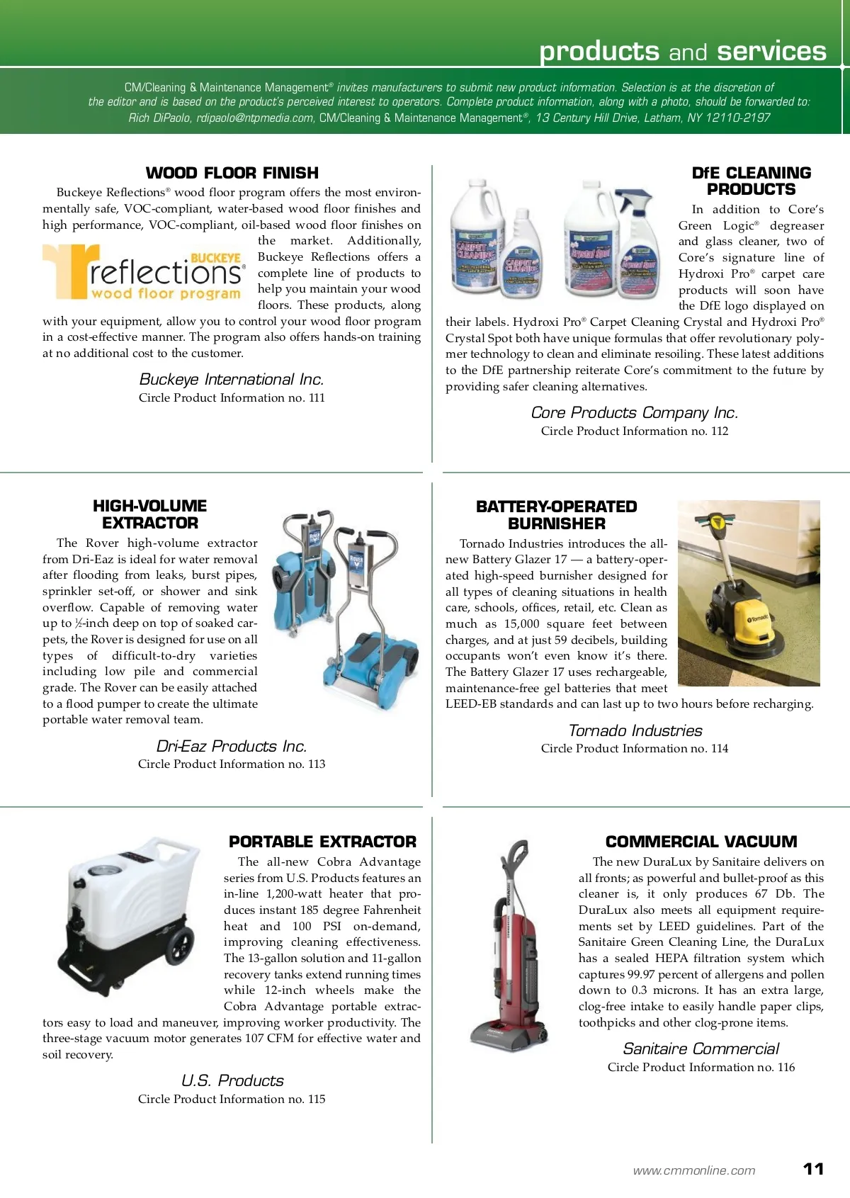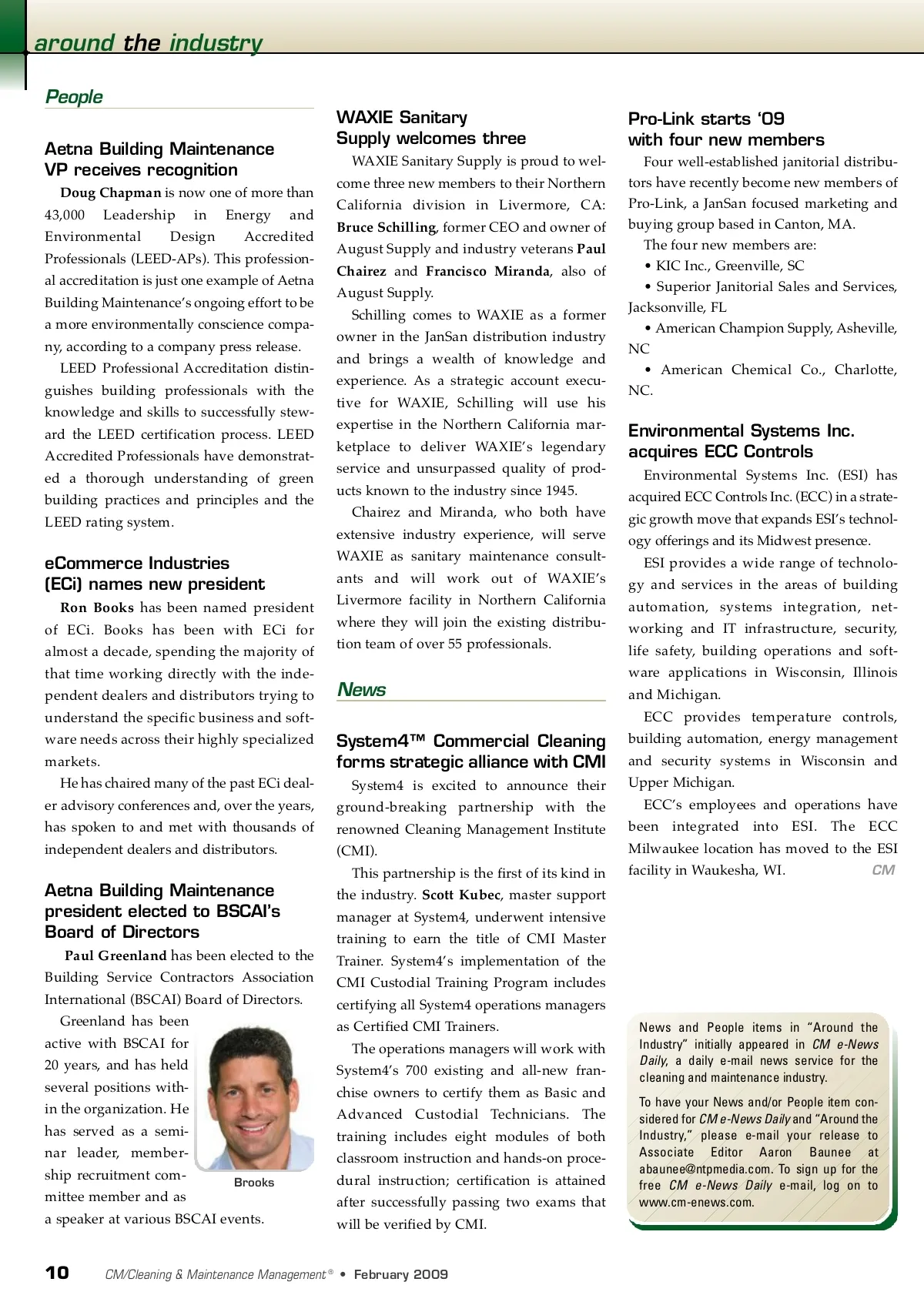 around the industry People Aetna Building Maintenance VP receives recognition Doug Chapman is now one of more than 43,000 Leadership in Energy and Environmental Design Accredited WAXIE Sanitary Supply welcomes three WAXIE Sanitary Supply is proud to wel-come three new members to their Northern California division in Livermore, CA: Bruce Schilling , former CEO and owner of August Supply and industry veterans Paul Chairez and Francisco Miranda , also of August Supply. Schilling comes to WAXIE as a former owner in the JanSan distribution industry and brings a wealth of knowledge and experience. As a strategic account execu-tive for WAXIE, Schilling will use his expertise in the Northern California mar-ketplace to deliver WAXIE’s legendary service and unsurpassed quality of prod-ucts known to the industry since 1945. Chairez and Miranda, who both have extensive industry experience, will serve WAXIE as sanitary maintenance consult-ants and will work out of WAXIE’s Livermore facility in Northern California where they will join the existing distribu-tion team of over 55 professionals. Pro-Link starts ‘09 with four new members Four well-established janitorial distribu-tors have recently become new members of Pro-Link, a JanSan focused marketing and buying group based in Canton, MA. The four new members are: • KIC Inc., Greenville, SC • Superior Janitorial Sales and Services, Jacksonville, FL • American Champion Supply, Asheville, NC • American Chemical Co., Charlotte, NC. Professionals (LEED-APs). This profession-al accreditation is just one example of Aetna Building Maintenance’s ongoing effort to be a more environmentally conscience compa-ny, according to a company press release. LEED Professional Accreditation distin-guishes building professionals with the knowledge and skills to successfully stew-ard the LEED certification process. LEED Accredited Professionals have demonstrat-ed a thorough understanding of green building practices and principles and the LEED rating system. Environmental Systems Inc. acquires ECC Controls Environmental Systems Inc. (ESI) has acquired ECC Controls Inc. (ECC) in a strate-gic growth move that expands ESI’s technol-ogy offerings and its Midwest presence. ESI provides a wide range of technolo-gy and services in the areas of building automation, systems integration, net-working and IT infrastructure, security, life safety, building operations and soft-ware applications in Wisconsin, Illinois and Michigan. ECC provides temperature controls, building automation, energy management and security systems in Wisconsin and Upper Michigan. ECC’s employees and operations have been integrated into ESI. The ECC Milwaukee location has moved to the ESI facility in Waukesha, WI. CM eCommerce Industries (ECi) names new president Ron Books has been named president of ECi. Books has been with ECi for almost a decade, spending the majority of that time working directly with the inde-pendent dealers and distributors trying to understand the specific business and soft-ware needs across their highly specialized markets. He has chaired many of the past ECi deal-er advisory conferences and, over the years, has spoken to and met with thousands of independent dealers and distributors. News System4™ Commercial Cleaning forms strategic alliance with CMI System4 is excited to announce their ground-breaking partnership with the renowned Cleaning Management Institute (CMI). This partnership is the first of its kind in the industry. Scott Kubec , master support manager at System4, underwent intensive training to earn the title of CMI Master Trainer. System4’s implementation of the CMI Custodial Training Program includes certifying all System4 operations managers as Certified CMI Trainers. The operations managers will work with System4’s 700 existing and all-new fran-chise owners to certify them as Basic and Advanced Custodial Technicians. The training includes eight modules of both classroom instruction and hands-on proce-Aetna Building Maintenance president elected to BSCAI’s Board of Directors Paul Greenland has been elected to the Building Service Contractors Association International (BSCAI) Board of Directors. Greenland has been active with BSCAI for 20 years, and has held several positions with-in the organization. He has served as a semi-nar leader, member-ship recruitment com-mittee member and as a speaker at various BSCAI events. Brooks News and People items in “Around the Industry” initially appeared in CM e-News Daily, a daily e-mail news service for the cleaning and maintenance industry. To have your News and/or People item con-sidered for CM e-News Daily and “Around the Industry,” please e-mail your release to Associate Editor Aaron Baunee at [email protected]. To sign up for the free CM e-News Daily e-mail, log on to www.cm-enews.com. dural instruction; certification is attained after successfully passing two exams that will be verified by CMI. 10 CM/Cleaning & Maintenance Management ® • February 2009