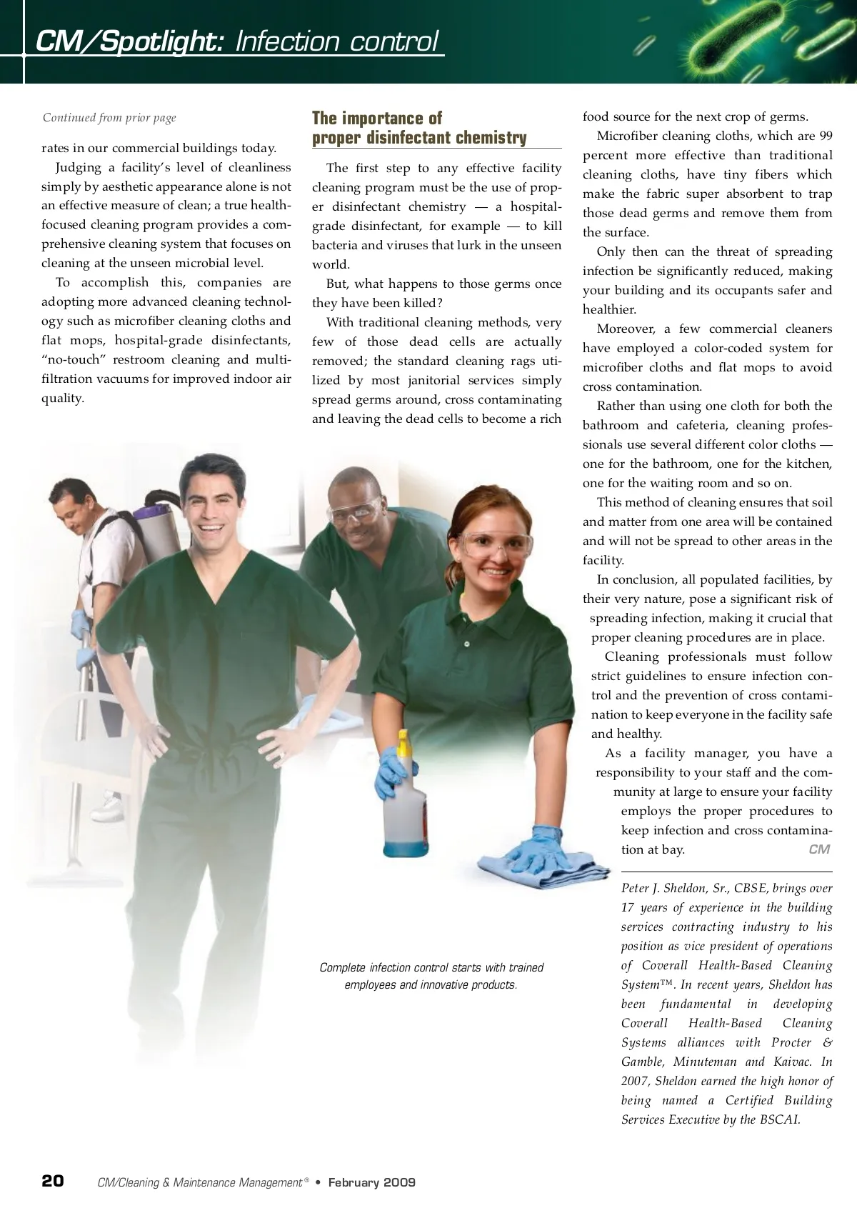 CM/Spotlight: Infection control Continued from prior page rates in our commercial buildings today. Judging a facility’s level of cleanliness simply by aesthetic appearance alone is not an effective measure of clean; a true health-focused cleaning program provides a com-prehensive cleaning system that focuses on cleaning at the unseen microbial level. To accomplish this, companies are adopting more advanced cleaning technol-ogy such as microfiber cleaning cloths and flat mops, hospital-grade disinfectants, “no-touch” restroom cleaning and multi-filtration vacuums for improved indoor air quality. The importance of proper disinfectant chemistry The first step to any effective facility cleaning program must be the use of prop-er disinfectant chemistry — a hospital-grade disinfectant, for example — to kill bacteria and viruses that lurk in the unseen world. But, what happens to those germs once they have been killed? With traditional cleaning methods, very few of those dead cells are actually removed; the standard cleaning rags uti-lized by most janitorial services simply spread germs around, cross contaminating and leaving the dead cells to become a rich food source for the next crop of germs. Microfiber cleaning cloths, which are 99 percent more effective than traditional cleaning cloths, have tiny fibers which make the fabric super absorbent to trap those dead germs and remove them from the surface. Only then can the threat of spreading infection be significantly reduced, making your building and its occupants safer and healthier. Moreover, a few commercial cleaners have employed a color-coded system for microfiber cloths and flat mops to avoid cross contamination. Rather than using one cloth for both the bathroom and cafeteria, cleaning profes-sionals use several different color cloths — one for the bathroom, one for the kitchen, one for the waiting room and so on. This method of cleaning ensures that soil and matter from one area will be contained and will not be spread to other areas in the facility. In conclusion, all populated facilities, by their very nature, pose a significant risk of spreading infection, making it crucial that proper cleaning procedures are in place. Cleaning professionals must follow strict guidelines to ensure infection con-trol and the prevention of cross contami-nation to keep everyone in the facility safe and healthy. As a facility manager, you have a responsibility to your staff and the com-munity at large to ensure your facility employs the proper procedures to keep infection and cross contamina-tion at bay. CM Peter J. Sheldon, Sr., CBSE, brings over 17 years of experience in the building services contracting industry to his position as vice president of operations of Coverall Health-Based Cleaning System™. In recent years, Sheldon has been fundamental in developing Coverall Health-Based Cleaning Systems alliances with Procter & Gamble, Minuteman and Kaivac. In 2007, Sheldon earned the high honor of being named a Certified Building Services Executive by the BSCAI. Complete infection control starts with trained employees and innovative products. 20 CM/Cleaning & Maintenance Management ® • February 2009