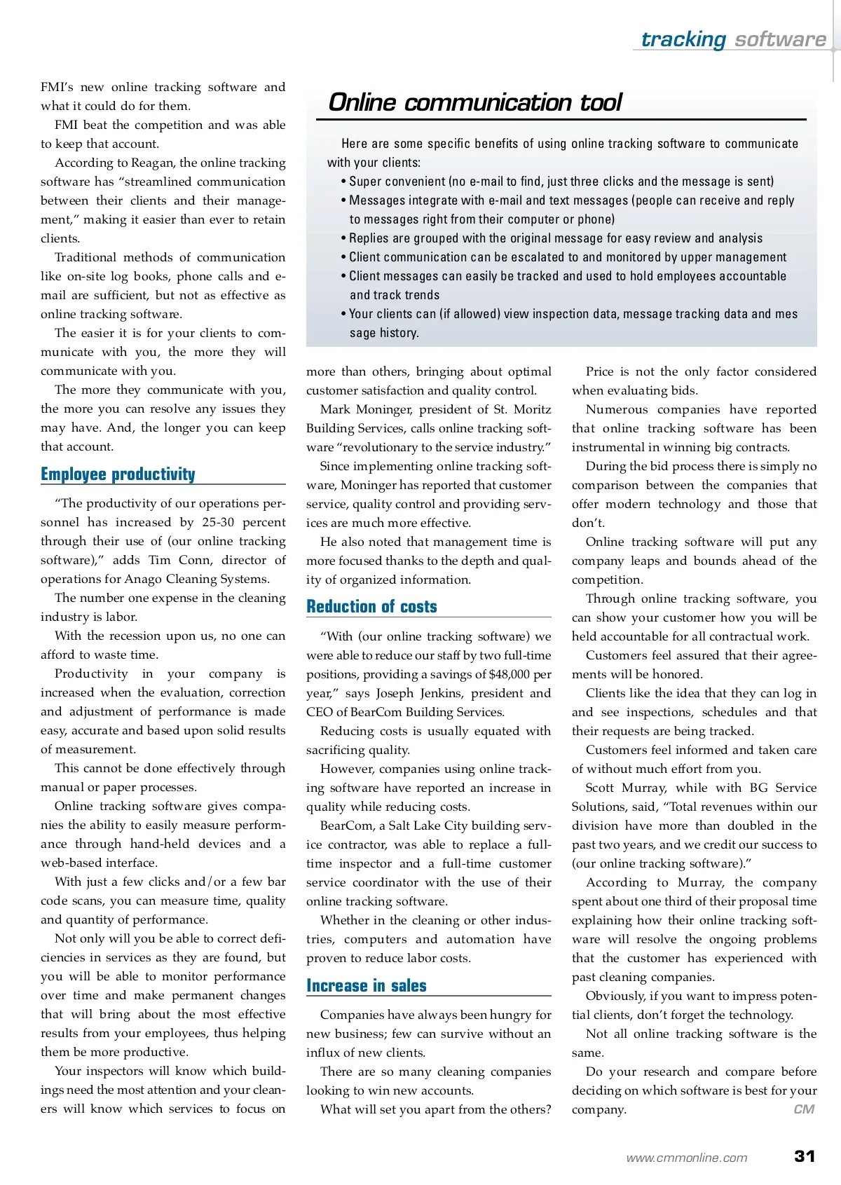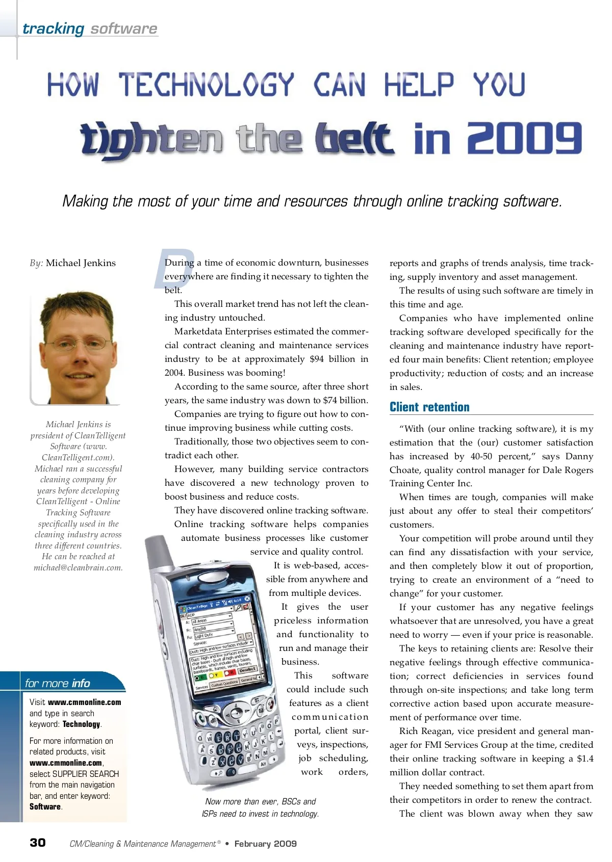 tracking software Making the most of your time and resources through online tracking software. By: Michael Jenkins D Michael Jenkins is president of CleanTelligent Software (www. CleanTelligent.com). Michael ran a successful cleaning company for years before developing CleanTelligent -Online Tracking Software specifically used in the cleaning industry across three different countries. He can be reached at [email protected]. for more info Visit www.cmmonline.com and type in search keyword: Technology . For more information on related products, visit www.cmmonline.com , select SUPPLIER SEARCH from the main navigation bar, and enter keyword: Software . During a time of economic downturn, businesses everywhere are finding it necessary to tighten the belt. This overall market trend has not left the clean-ing industry untouched. Marketdata Enterprises estimated the commer-cial contract cleaning and maintenance services industry to be at approximately $94 billion in 2004. Business was booming! According to the same source, after three short years, the same industry was down to $74 billion. Companies are trying to figure out how to con-tinue improving business while cutting costs. Traditionally, those two objectives seem to con-tradict each other. However, many building service contractors have discovered a new technology proven to boost business and reduce costs. They have discovered online tracking software. Online tracking software helps companies automate business processes like customer service and quality control. It is web-based, acces-sible from anywhere and from multiple devices. It gives the user priceless information and functionality to run and manage their business. This software could include such features as a client communication portal, client sur-veys, inspections, job scheduling, work orders, Now more than ever, BSCs and ISPs need to invest in technology. reports and graphs of trends analysis, time track-ing, supply inventory and asset management. The results of using such software are timely in this time and age. Companies who have implemented online tracking software developed specifically for the cleaning and maintenance industry have report-ed four main benefits: Client retention; employee productivity; reduction of costs; and an increase in sales. Client retention “With (our online tracking software), it is my estimation that the (our) customer satisfaction has increased by 40-50 percent,” says Danny Choate, quality control manager for Dale Rogers Training Center Inc. When times are tough, companies will make just about any offer to steal their competitors’ customers. Your competition will probe around until they can find any dissatisfaction with your service, and then completely blow it out of proportion, trying to create an environment of a “need to change” for your customer. If your customer has any negative feelings whatsoever that are unresolved, you have a great need to worry — even if your price is reasonable. The keys to retaining clients are: Resolve their negative feelings through effective communica-tion; correct deficiencies in services found through on-site inspections; and take long term corrective action based upon accurate measure-ment of performance over time. Rich Reagan, vice president and general man-ager for FMI Services Group at the time, credited their online tracking software in keeping a $1.4 million dollar contract. They needed something to set them apart from their competitors in order to renew the contract. The client was blown away when they saw 30 CM/Cleaning & Maintenance Management ® • February 2009