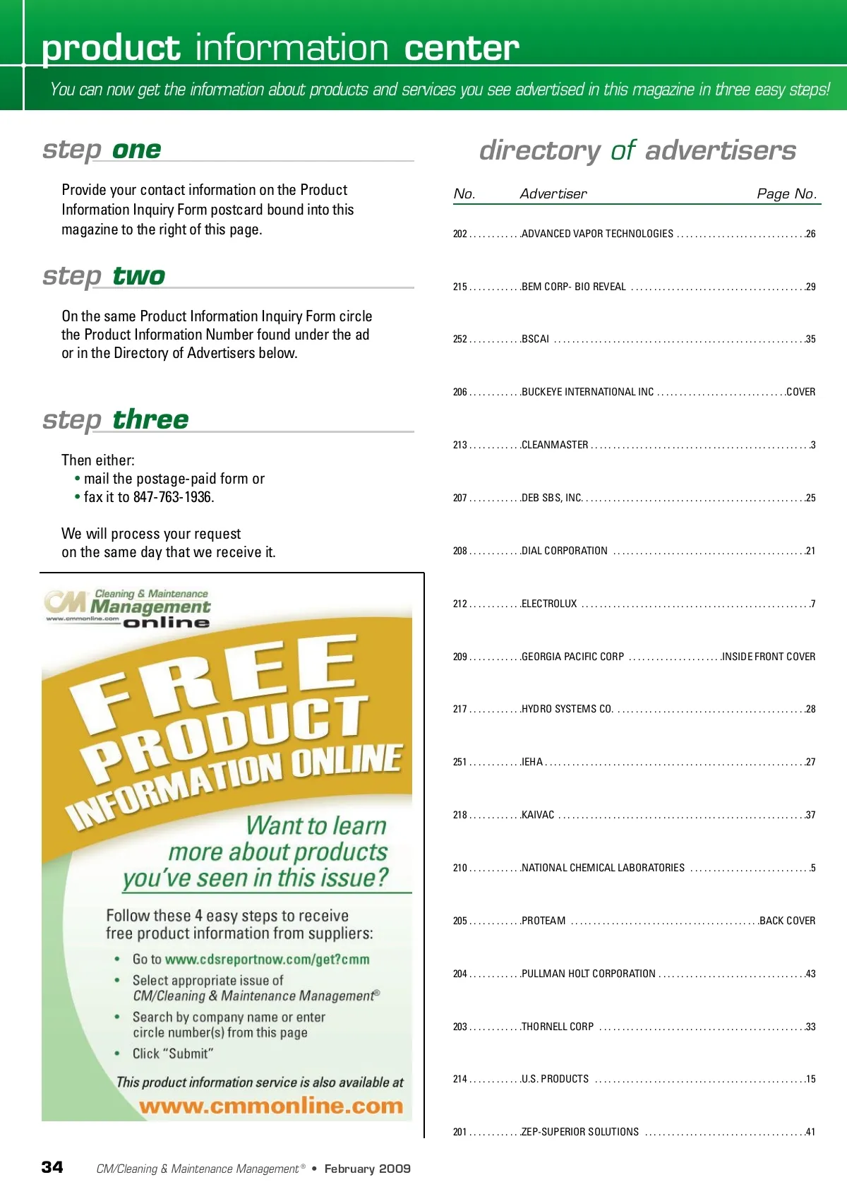product information center You can now get the information about products and services you see advertised in this magazine in three easy steps! step one Provide your contact information on the Product Information Inquiry Form postcard bound into this magazine to the right of this page. No. directory of advertisers Advertiser Page No. 202 . . . . . . . . . . . .ADVANCED VAPOR TECHNOLOGIES . . . . . . . . . . . . . . . . . . . . . . . . . . . . .26 step two On the same Product Information Inquiry Form circle the Product Information Number found under the ad or in the Directory of Advertisers below. 215 . . . . . . . . . . . .BEM CORP-BIO REVEAL . . . . . . . . . . . . . . . . . . . . . . . . . . . . . . . . . . . . . . .29 252 . . . . . . . . . . . .BSCAI . . . . . . . . . . . . . . . . . . . . . . . . . . . . . . . . . . . . . . . . . . . . . . . . . . . . . . . .35 206 . . . . . . . . . . . .BUCKEYE INTERNATIONAL INC . . . . . . . . . . . . . . . . . . . . . . . . . . . . .COVER step three 213 . . . . . . . . . . . .CLEANMASTER . . . . . . . . . . . . . . . . . . . . . . . . . . . . . . . . . . . . . . . . . . . . . . . . .3 Then either: • mail the postage-paid form or • fax it to 847-763-1936. We will process your request on the same day that we receive it. 207 . . . . . . . . . . . .DEB SBS, INC. . . . . . . . . . . . . . . . . . . . . . . . . . . . . . . . . . . . . . . . . . . . . . . . . .25 208 . . . . . . . . . . . .DIAL CORPORATION . . . . . . . . . . . . . . . . . . . . . . . . . . . . . . . . . . . . . . . . . . .21 212 . . . . . . . . . . . .ELECTROLUX . . . . . . . . . . . . . . . . . . . . . . . . . . . . . . . . . . . . . . . . . . . . . . . . . . .7 209 . . . . . . . . . . . .GEORGIA PACIFIC CORP . . . . . . . . . . . . . . . . . . . . .INSIDE FRONT COVER 217 . . . . . . . . . . . .HYDRO SYSTEMS CO. . . . . . . . . . . . . . . . . . . . . . . . . . . . . . . . . . . . . . . . . . .28 251 . . . . . . . . . . . .IEHA . . . . . . . . . . . . . . . . . . . . . . . . . . . . . . . . . . . . . . . . . . . . . . . . . . . . . . . . . .27 218 . . . . . . . . . . . .KAIVAC . . . . . . . . . . . . . . . . . . . . . . . . . . . . . . . . . . . . . . . . . . . . . . . . . . . . . . .37 210 . . . . . . . . . . . .NATIONAL CHEMICAL LABORATORIES . . . . . . . . . . . . . . . . . . . . . . . . . . .5 205 . . . . . . . . . . . .PROTEAM . . . . . . . . . . . . . . . . . . . . . . . . . . . . . . . . . . . . . . . . . .BACK COVER 204 . . . . . . . . . . . .PULLMAN HOLT CORPORATION . . . . . . . . . . . . . . . . . . . . . . . . . . . . . . . . .43 203 . . . . . . . . . . . .THORNELL CORP . . . . . . . . . . . . . . . . . . . . . . . . . . . . . . . . . . . . . . . . . . . . . .33 214 . . . . . . . . . . . .U.S. PRODUCTS . . . . . . . . . . . . . . . . . . . . . . . . . . . . . . . . . . . . . . . . . . . . . . .15 201 . . . . . . . . . . . .ZEP-SUPERIOR SOLUTIONS . . . . . . . . . . . . . . . . . . . . . . . . . . . . . . . . . . . .41 34 CM/Cleaning & Maintenance Management ® • February 2009