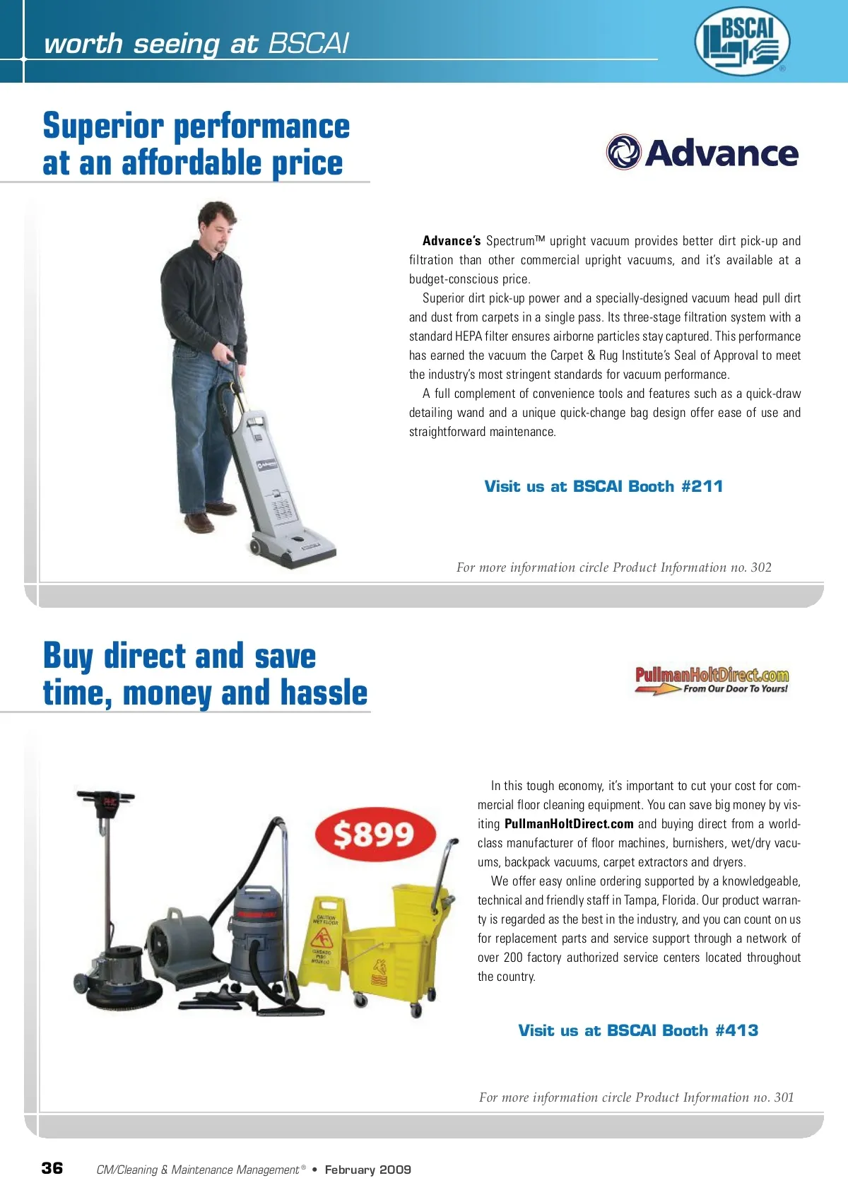 worth seeing at BSCAI Superior performance at an affordable price Advance’s Spectrum™ upright vacuum provides better dirt pick-up and filtration than other commercial upright vacuums, and it’s available at a budget-conscious price. Superior dirt pick-up power and a specially-designed vacuum head pull dirt and dust from carpets in a single pass. Its three-stage filtration system with a standard HEPA filter ensures airborne particles stay captured. This performance has earned the vacuum the Carpet & Rug Institute’s Seal of Approval to meet the industry’s most stringent standards for vacuum performance. A full complement of convenience tools and features such as a quick-draw detailing wand and a unique quick-change bag design offer ease of use and straightforward maintenance. Visit us at BSCAI Booth #211 For more information circle Product Information no. 302 Buy direct and save time, money and hassle In this tough economy, it’s important to cut your cost for com-mercial floor cleaning equipment. You can save big money by vis-iting PullmanHoltDirect.com and buying direct from a world-class manufacturer of floor machines, burnishers, wet/dry vacu-ums, backpack vacuums, carpet extractors and dryers. We offer easy online ordering supported by a knowledgeable, technical and friendly staff in Tampa, Florida. Our product warran-ty is regarded as the best in the industry, and you can count on us for replacement parts and service support through a network of over 200 factory authorized service centers located throughout the country. Visit us at BSCAI Booth #413 For more information circle Product Information no. 301 36 CM/Cleaning & Maintenance Management ® • February 2009
