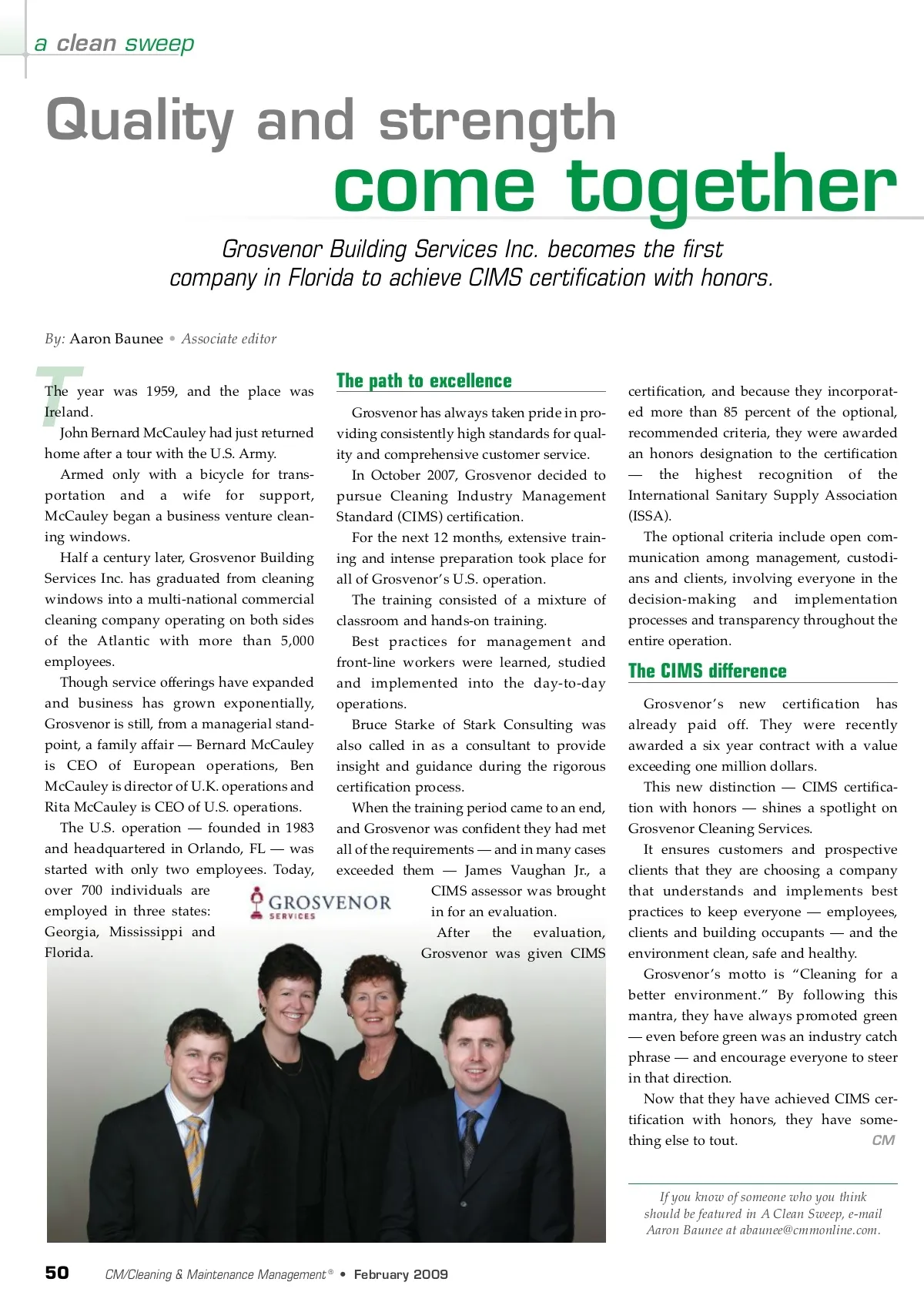 a clean sweep Quality and strength come together The path to excellence Grosvenor has always taken pride in pro-viding consistently high standards for qual-ity and comprehensive customer service. In October 2007, Grosvenor decided to pursue Cleaning Industry Management Standard (CIMS) certification. For the next 12 months, extensive train-ing and intense preparation took place for all of Grosvenor’s U.S. operation. The training consisted of a mixture of classroom and hands-on training. Best practices for management and front-line workers were learned, studied and implemented into the day-to-day operations. Bruce Starke of Stark Consulting was also called in as a consultant to provide insight and guidance during the rigorous certification process. When the training period came to an end, and Grosvenor was confident they had met all of the requirements — and in many cases exceeded them — James Vaughan Jr., a CIMS assessor was brought in for an evaluation. After the evaluation, Grosvenor was given CIMS certification, and because they incorporat-ed more than 85 percent of the optional, recommended criteria, they were awarded an honors designation to the certification — the highest recognition of the International Sanitary Supply Association (ISSA). The optional criteria include open com-munication among management, custodi-ans and clients, involving everyone in the decision-making and implementation processes and transparency throughout the entire operation. Grosvenor Building Services Inc. becomes the first company in Florida to achieve CIMS certification with honors. By: Aaron Baunee • Associate editor T The year was 1959, and the place was Ireland. John Bernard McCauley had just returned home after a tour with the U.S. Army. Armed only with a bicycle for trans-portation and a wife for support, McCauley began a business venture clean-ing windows. Half a century later, Grosvenor Building Services Inc. has graduated from cleaning windows into a multi-national commercial cleaning company operating on both sides of the Atlantic with more than 5,000 employees. Though service offerings have expanded and business has grown exponentially, Grosvenor is still, from a managerial stand-point, a family affair — Bernard McCauley is CEO of European operations, Ben McCauley is director of U.K. operations and Rita McCauley is CEO of U.S. operations. The U.S. operation — founded in 1983 and headquartered in Orlando, FL — was started with only two employees. Today, over 700 individuals are employed in three states: Georgia, Mississippi and Florida. The CIMS difference Grosvenor’s new certification has already paid off. They were recently awarded a six year contract with a value exceeding one million dollars. This new distinction — CIMS certifica-tion with honors — shines a spotlight on Grosvenor Cleaning Services. It ensures customers and prospective clients that they are choosing a company that understands and implements best practices to keep everyone — employees, clients and building occupants — and the environment clean, safe and healthy. Grosvenor’s motto is “Cleaning for a better environment.” By following this mantra, they have always promoted green — even before green was an industry catch phrase — and encourage everyone to steer in that direction. Now that they have achieved CIMS cer-tification with honors, they have some-CM thing else to tout. If you know of someone who you think should be featured in A Clean Sweep, e-mail Aaron Baunee at [email protected]. 50 CM/Cleaning & Maintenance Management ® • February 2009